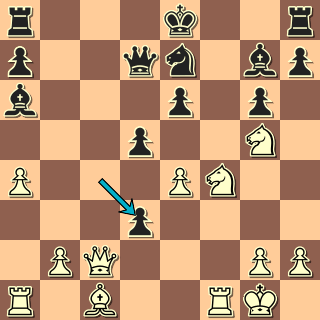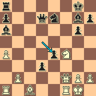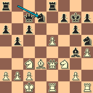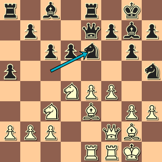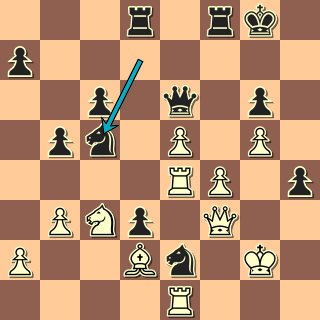 Během tří tahů se pozice změnila a černý má luxusní hru. 18. Dd4 Sxf3 19. gxf3? Lépe vložit 19. e6+ Jdf6 20. gxf3. 19. … Jxe5! Nelze totiž 20. f4? Jxf4 21. Dxf4?? Jxd3+ nebo dokonce, jak mi ukazuje program, 20. … Vad8 s úplným rozpadem bílé pozice. 20. Je4? Vad8