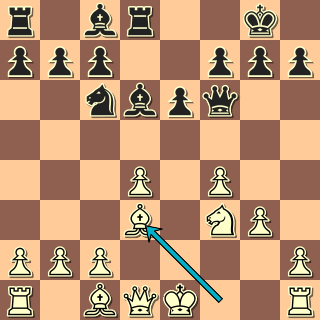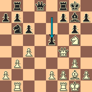 10. … Jxd4! Jako ledabylý divák jsem si v tu chvíli nebyl jistý, kdo vlastně přichází o figuru … 11. Jxd4 Sb4+ Hezky vymyšleno. 12. Ke2? I po nejlepším 12. c3 vychází Dxd4!, paradoxně šlo taky ustoupit do šachu 12. Kf2!? Dxd4+ 13. Se3. 12. … e5! Instruktivní! Na krále v centru se otevírají všechny dráhy. Vxd4 šlo ovšem taky. 13. h3 Hrozilo Sg4+. Po 13. Jf3 by přišlo e4.