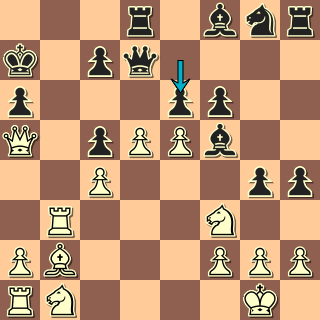 Další z nevšedních pozic zápasu. Černý si nejspíš myslel, že bez vývinu a bez centra vyhraje křídelním útokem a zahrál 11. … g4? Jak už psal Pokyn, jezdec z f3 ustupovat nebude a to hoodně dlouho! 12. d5! a6? 12. … gxf3 13. Dxf3 by bylo o fous míň bezperspektivní. 13. Sxc6 bxc6 14. Da4!