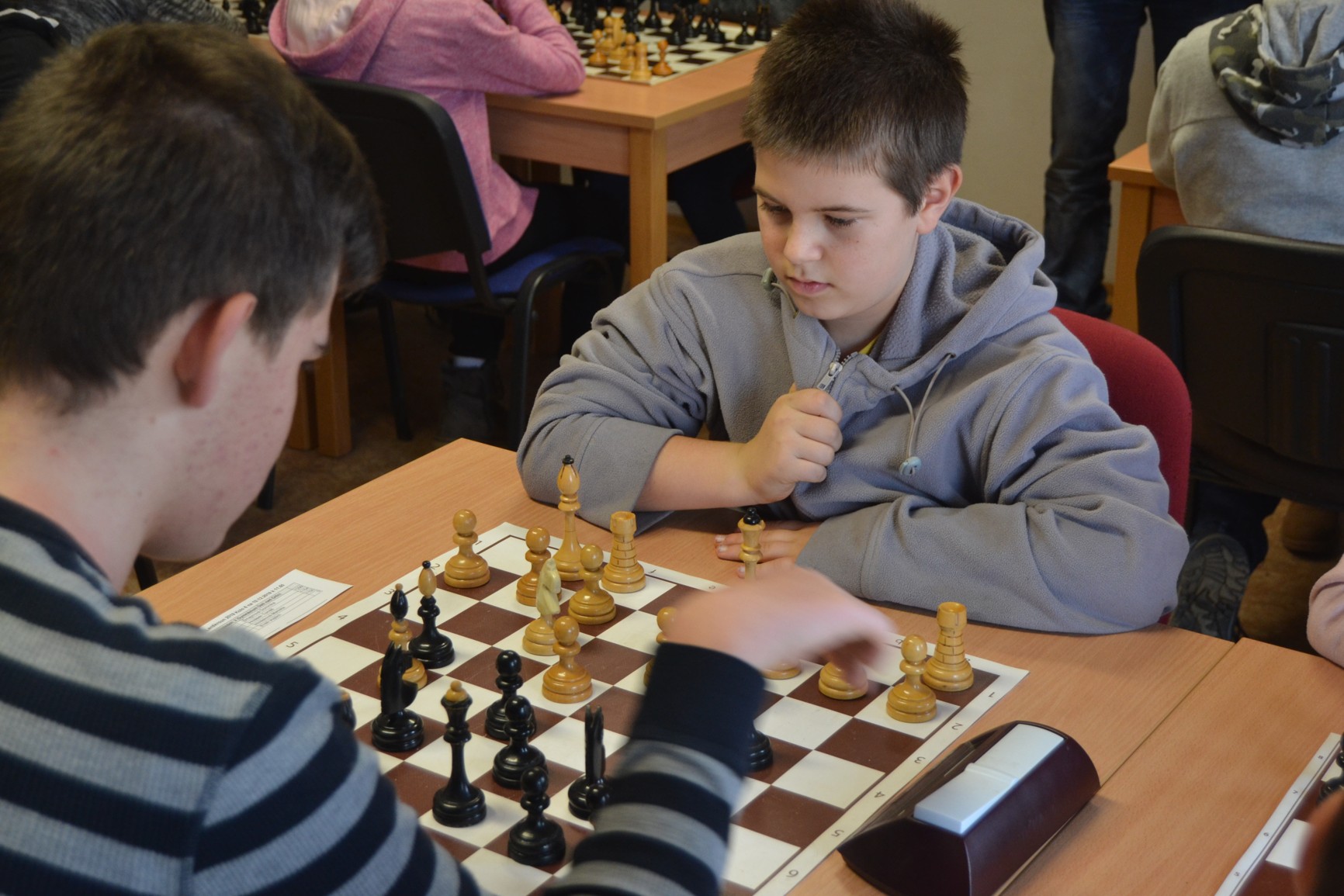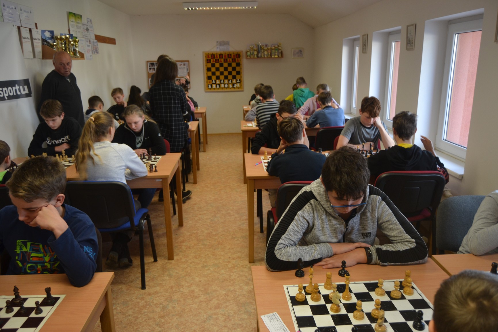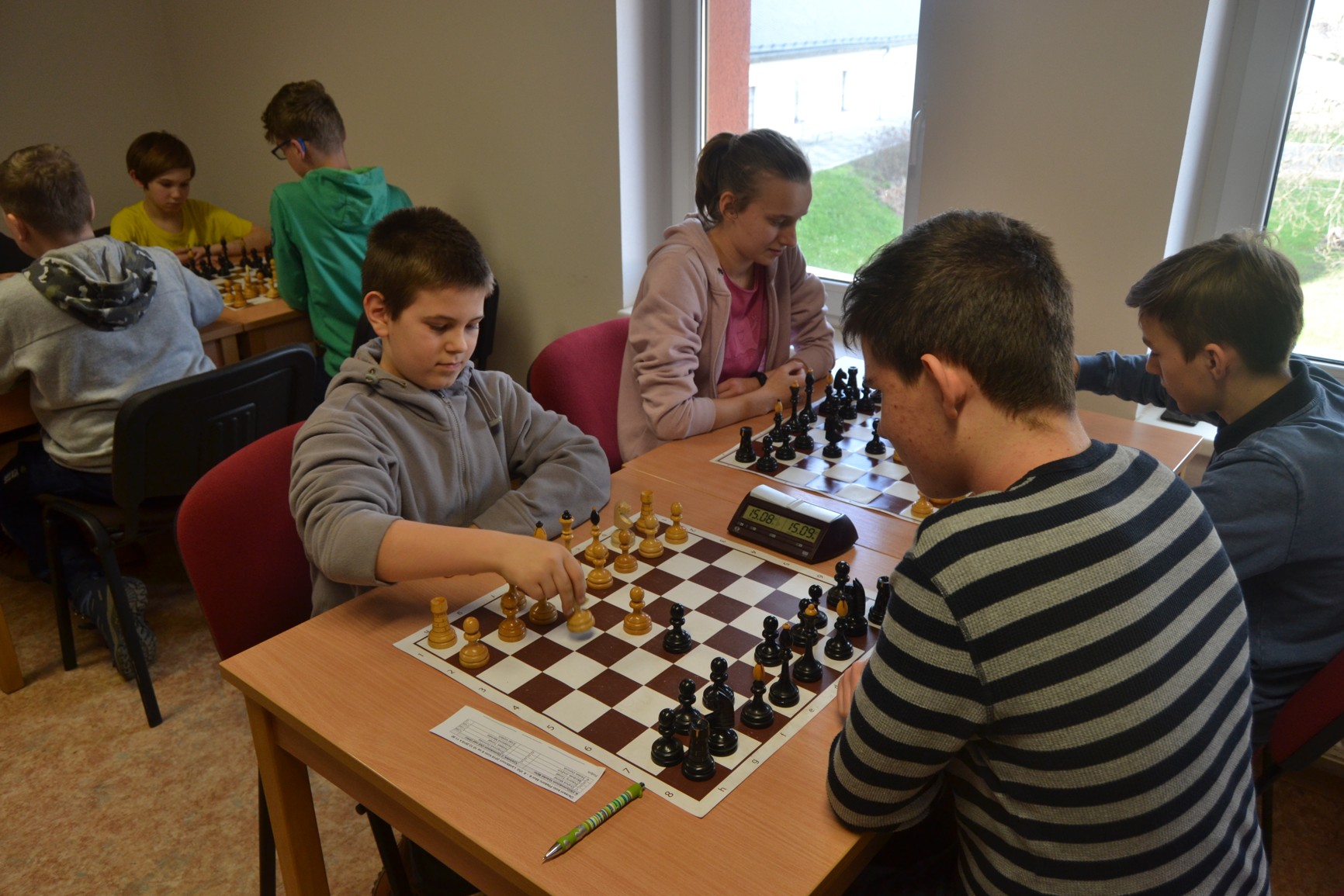 A i nadále to šlo, poráželi jsme jednoho za druhým, jedinou zápasovou půlku jsme ztratili s Kláštercem (to je skoro taky Kunvald). Jenže … Jiráskovka už moc neztrácela, kdežto my jsme tu bodík, tu půlčičku vyhodili oknem. Domča, která dala koncovku s figurou víc za remis, protože se obávala, že to na 30 s nezvládne hrát. Tomáš, který přehlédl jednotažec na g7 a taky dal – bez konzultace – za půl koncovku s figurou navíc (v zajetí předchozího průběhu, kdy byl prohraný). Markétka, která v koncovce s věží navíc sáhla na věž a musela ji zadarmo představit. A Vojta, který souhlasil s matem, když mohl (dlouhým tahem) šachující dámu sebrat.