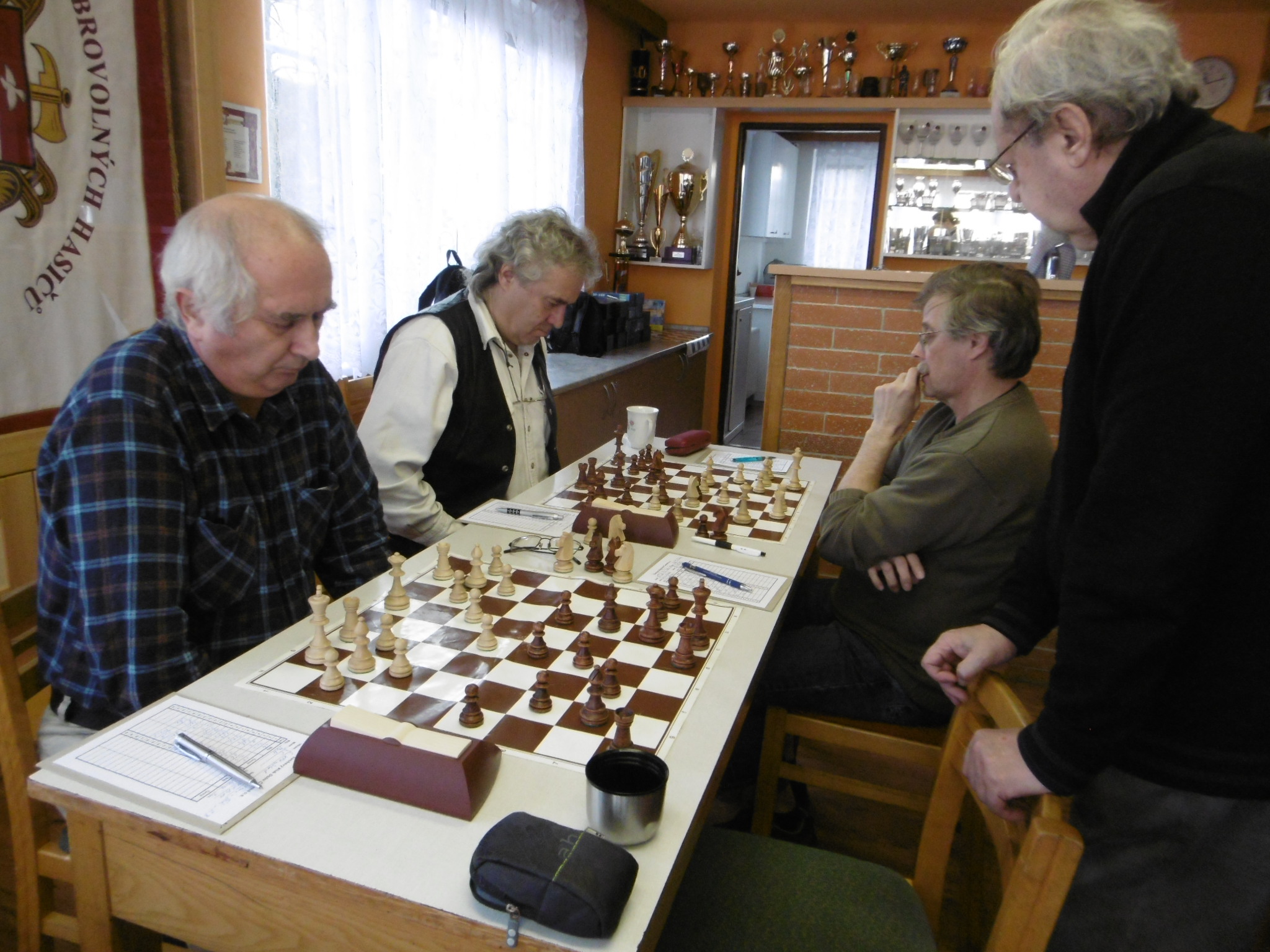Po zahájení žádná hitparáda, moc se mi nezdály pozice na posledních dvou a zejména moje. Naštěstí klid přišel poměrně rychle, obratem ze základních příruček s obětí na h7 (po dobrání Jg5+ Kg6 Dg4, pamatuji si partii Hora-někdo) vyhrál Jarda Volf a jal se vyhledat nejbližší restaurant. Po vcelku korektní půlce na sedmé (i když Tomáš Mastný v jedné pozici asi přehlédl vítěznou taktiku) dodal druhý bod kapitán Bohouš, jehož soupeř si v horší věžovce vybral přechod do nehájitelné pěšcovky.
