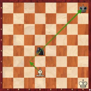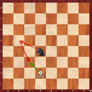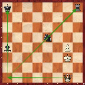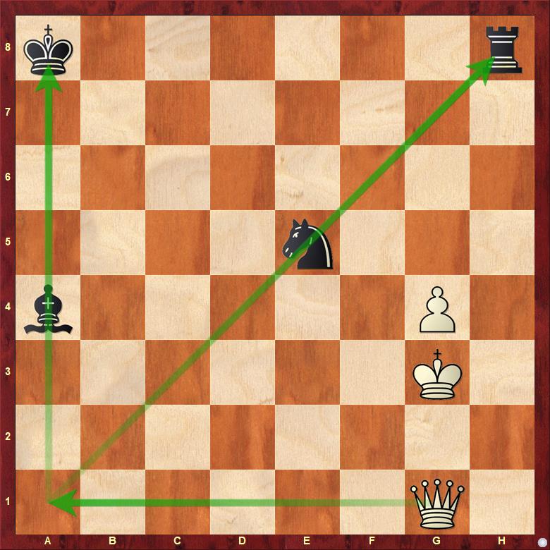 Dáma spojuje možnosti věže a střelce, vázat může rovně i šikmo. Zde po 1. Da1 váže střelce i jezdce. (Tento tah je zároveň vidlička, tedy dvojí úder.)
