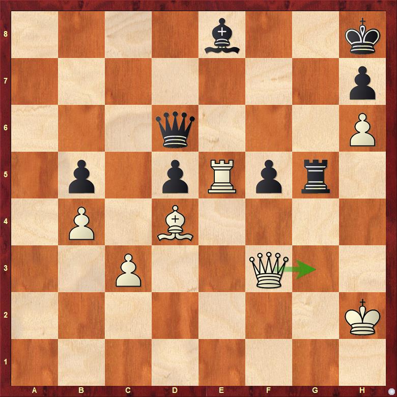 (Pro pokročilejší: kombinace je to ještě složitější, černý totiž může zahrát – a taky zahrál – 45. … Dxh6+ 46. Dh3 Dd6, ale teď už jde tah Kh1, který předtím s dámou na f3 nešel: 47. Kh1! Vazba je definitivně zrušena a proti Vxe8 není obrana. Partie skončila po 47. … Kg8 49. Vxe8+ Kf7 50. Vh8. 1:0)