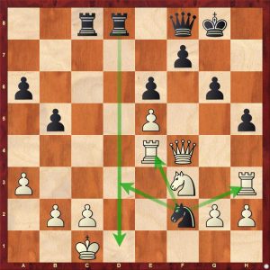 Zahrál 24. … Jg4-f2 a podívejte se, co všechno jezdec hrozí: napadá věž na h3, napadá věž na e4, hrozí Jd3+, což je další vidlička na krále a dámu, a hlavně vytváří matovou hrozbu Vd1 mat. (Aaron – Filip, Stockholm 1962, podle pěkné knížky Jiřího Veselého Černobílé otazníky)