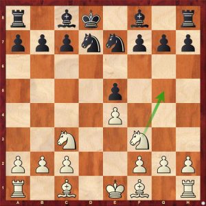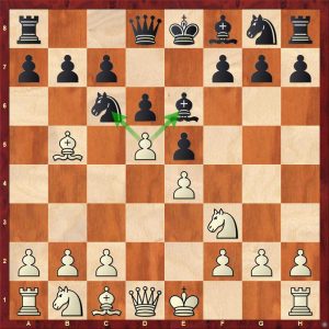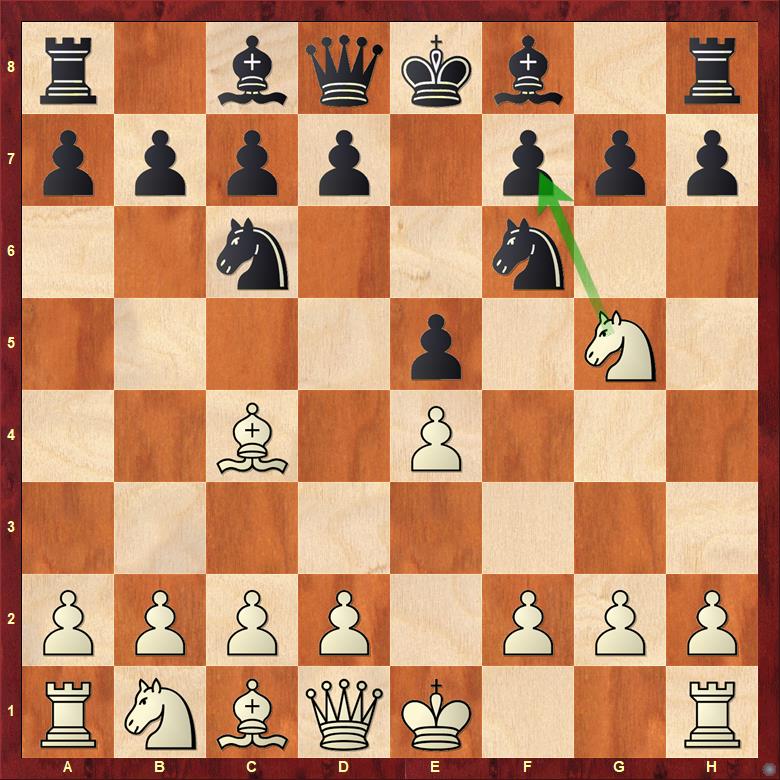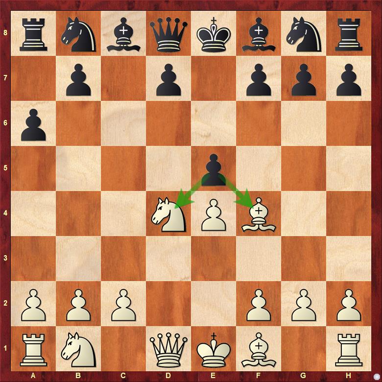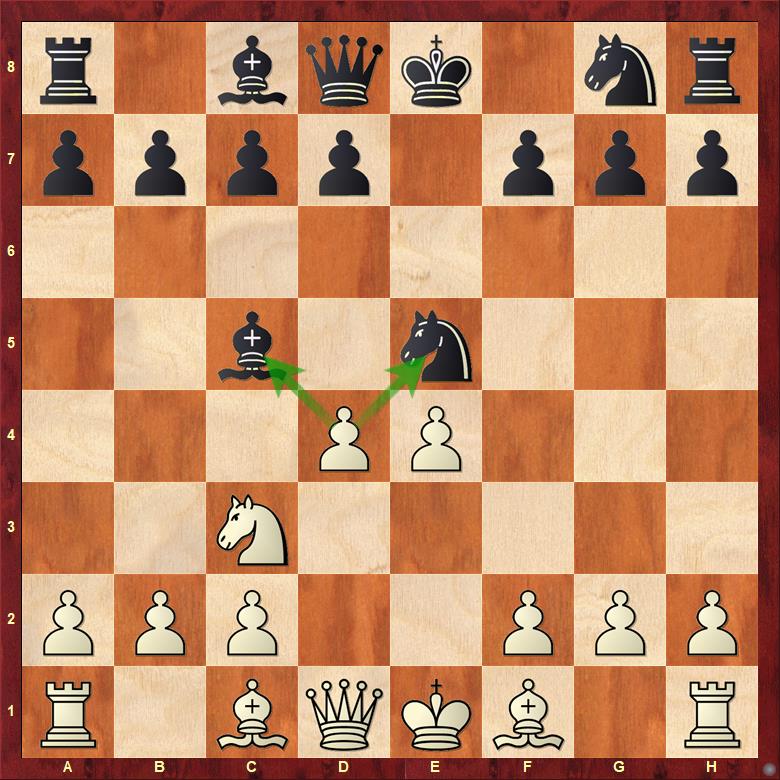 … je tu vidlička 5. … e5!! a figura je pryč, po 6. Sxe5 totiž přijde další vidlička 6. … Da5+ na krále a střelce.