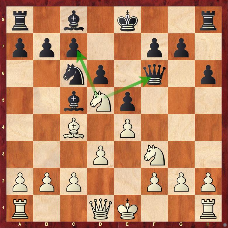 dává jezdec vidličku na dámu a na pěšce c7, kde je další vidlička na krále a na věž. Černý má ovšem obranu 8. … Dd8, jen ztratil tempo. Mohl by se ovšem zmýlit a zahrát 8. … De6??, potom by 9. Jxc7+ byl „šach celé rodině“, totiž úder na krále, dámu i věž.
