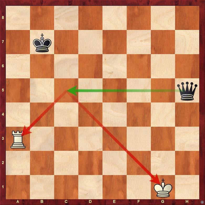 Velmi častá situace v koncovce je vyšachování věže dámou. Zde po 1. … Dc5+. Pokud se v koncovce D x V vzdálí věž od krále, během pár tahů je po ní.