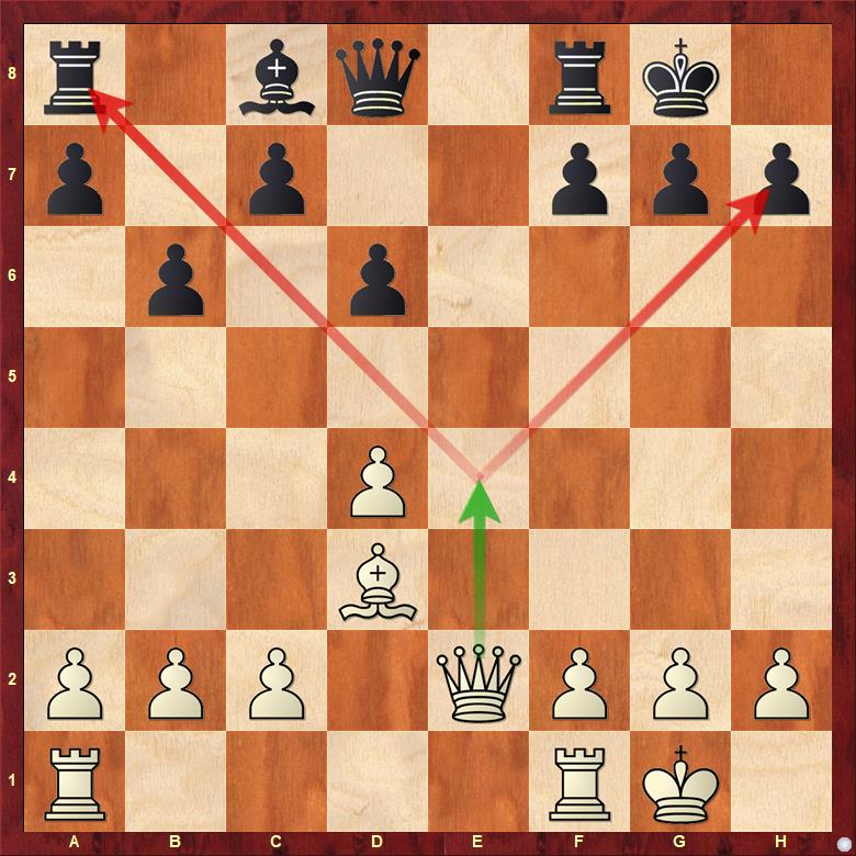 Podobně tady je po 1. De4 vidlička nejen na věž a pěšce, ale braní pěšce na h7 je zároveň mat – černý musí dát věž. (Tedy přesněji střelce po 1. … Sf5.)