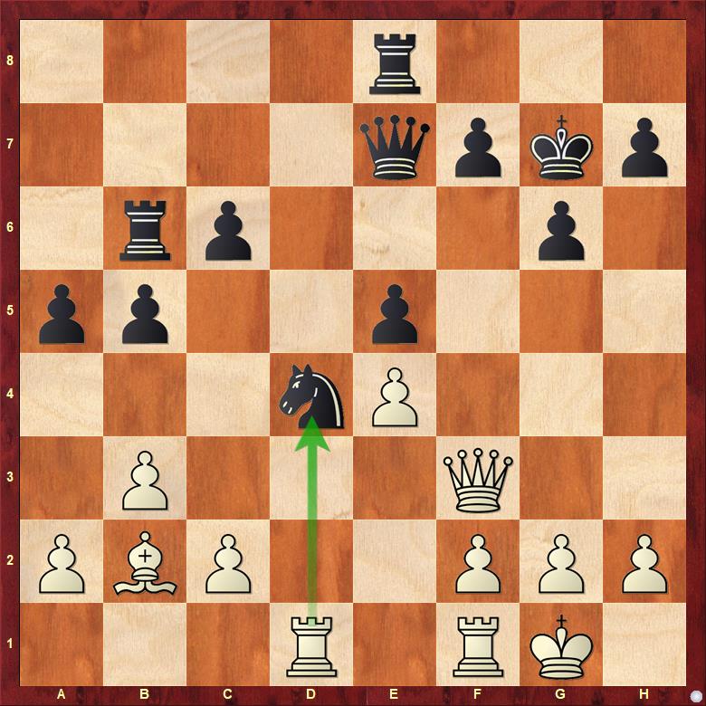 V další pozici máme kombinaci – oběť materiálu. Bílý by mohl hrát 1. Sxd4, ale po 1. … exd4 by získal jen pěšce (a možná ani toho ne). Jenže může dočasně obětovat kvalitu: 1. Vxd4!! exd4 (brát se nemusí, ale pak černý přišel o figuru už teď) 2. Sxd4+ a vidle na krále a na věž.