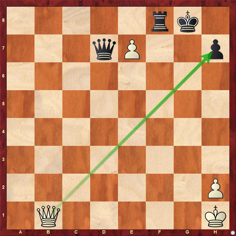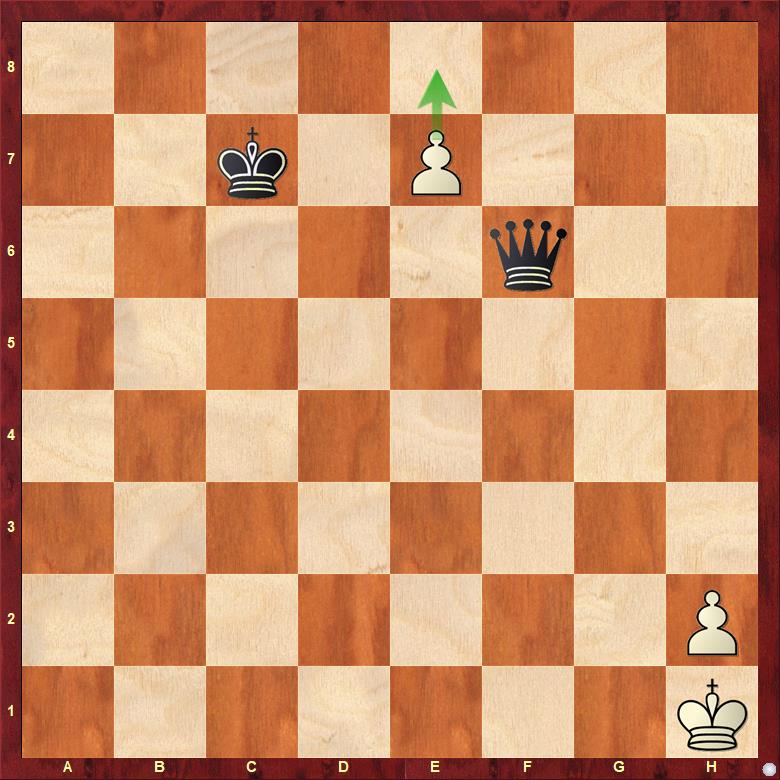 Tady by si kdekdo postavil dámu, ale to by byla chyba, po 1. e8D?? je Df1 mat! Vyhrává ale 1. e8J+!! a bílý získává vidličkou dámu a vyhraje (protože h pěšcem dojde do dámy a matí).