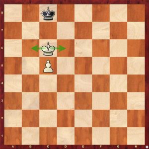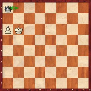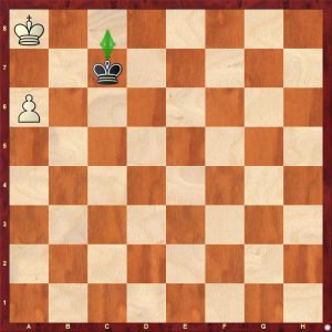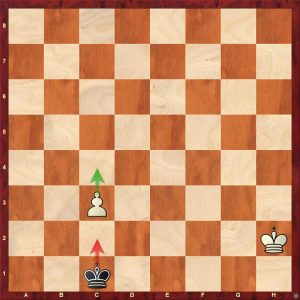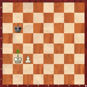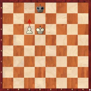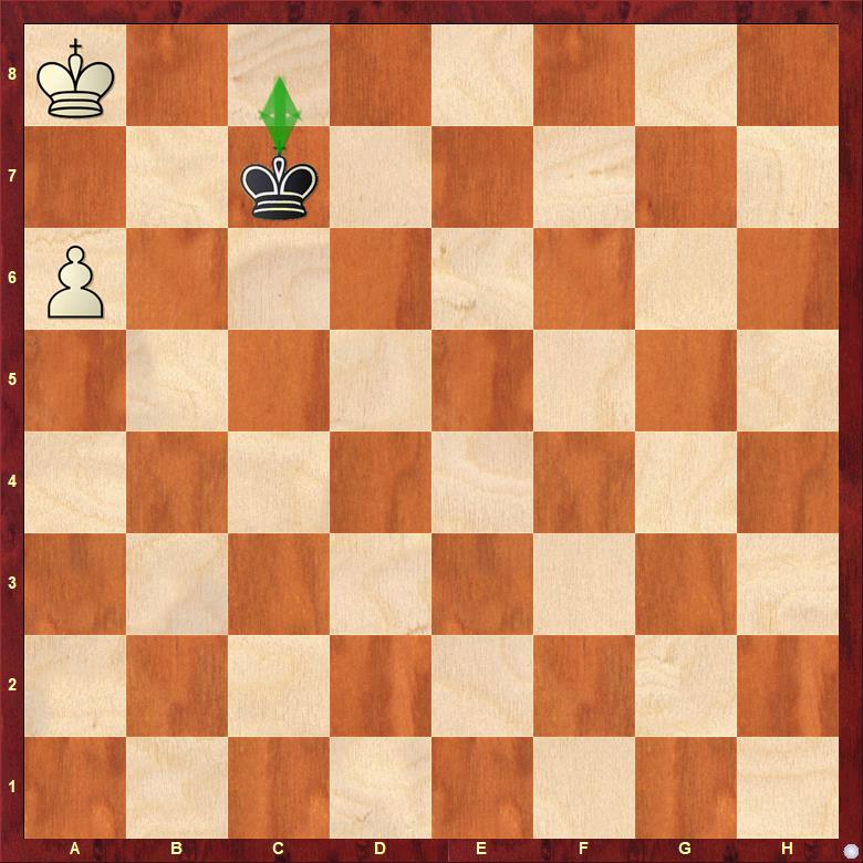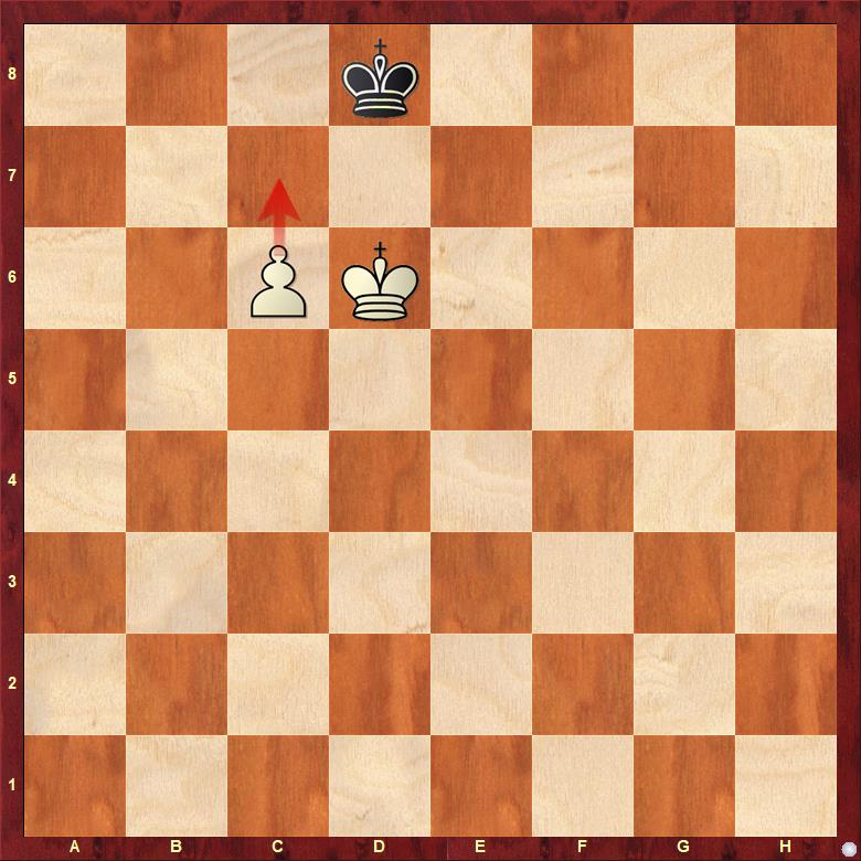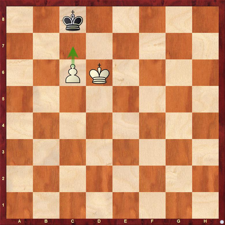 Naopak tady je 1. c7+ se šachem, tedy remis. Po 1. … Kc8 přijde buď 2. Kc6 pat, nebo bílý pěšce ztratí.