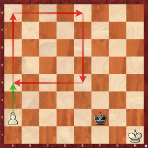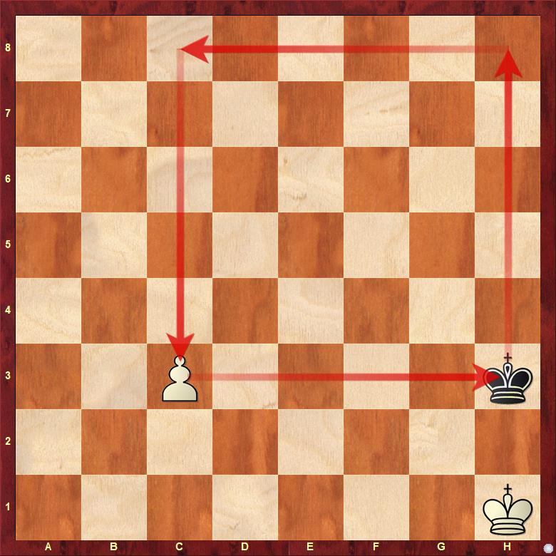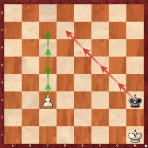 Protože pěšec chodí o jedno a král taky, dá se snadno spočítat, jestli král pěšce chytí. Když má pěšec náskok, uteče – král nedovede zrychlit. Zde se černý na tahu může marně snažit, po 1. … Kc2 2. c4 Kc3 3. c5 atd. pěšec utíká.