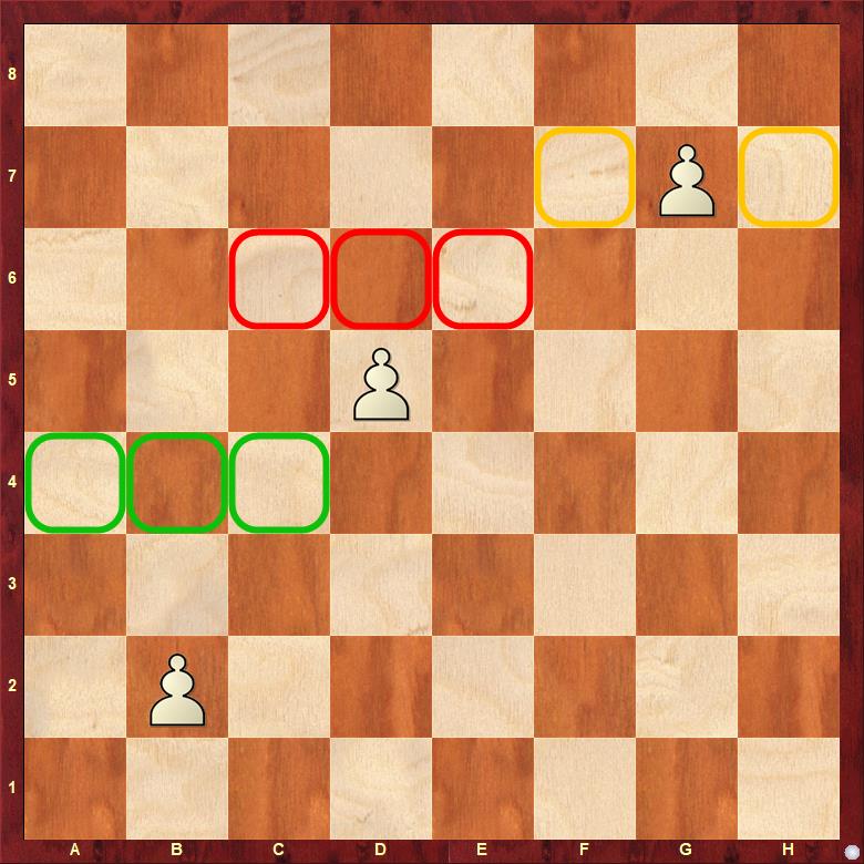 Existuje nějaká teorie kritických polí, která říká, že když král obsadí jedno z kritických polí svého pěšce, vyhraje. Kritická pole jsem tu obarvil – pro pb2 zeleně, pro pd5 červeně, pro pg7 žlutě. Jenže jak si má začátečník pamatovat, kde ta kritická pole jsou? Možná je radši zatím pusťte z hlavy, ukážeme si to jinak.