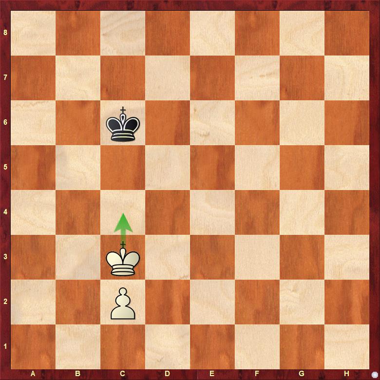 Černý se brání prostě tak, že stojí pěšci v cestě. Bílý proto musí vytlačit krále svým králem – „král dělá pěšci cestičku“. K tomu slouží opozice – postavení králů proti sobě. Bílý tu zahraje 1. Kc4! (pozor, všechny ostatní tahy jsou jen remis!) a říká černému: „Uhni!“. Dál může hra vypadat třeba takhle: 1 … Kb6 2. Kd5! Kb5 3. c4+ (lze i 3. c3 Kb6 4. c4 Kc7 5. Kc5 atd.) 3. … Kb6 4. Kd6! Kb7 5. c5 Kc8 6. Kc6! (znova opozice, jen ne 6. c6?? Kd8 remis!) 6. … Kd8 7. Kb7 Kd7 8. c6+ atd.