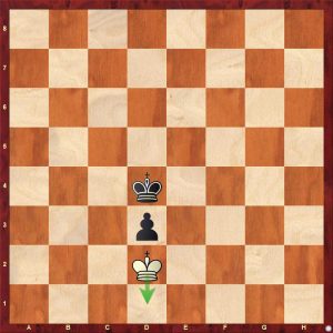 To, že je nějaká pozice remízová, ale ještě neznamená, že remízou skončí, je třeba ji správně bránit. Tady remízuje jedině 1. Kd1! a v příštím tahu půjdeme na jednu nebo na druhou stranu do opozice – po Kc3 přijde Kc1, po Ke3 zase Ke1. Černý to může zkoušet horem dolem, obcházet různá pole na čtvrté nebo páté řadě, ale stačí tahat králem na sloupci pod pěšcem: Kd1-d2-d1-d2-d1 … Například po 1. … Kc4 nesmíme dát 2. Kc1?? Kc3!-+, ale 2. Kd2 Kd4 3. Kd1! atd.