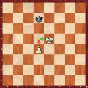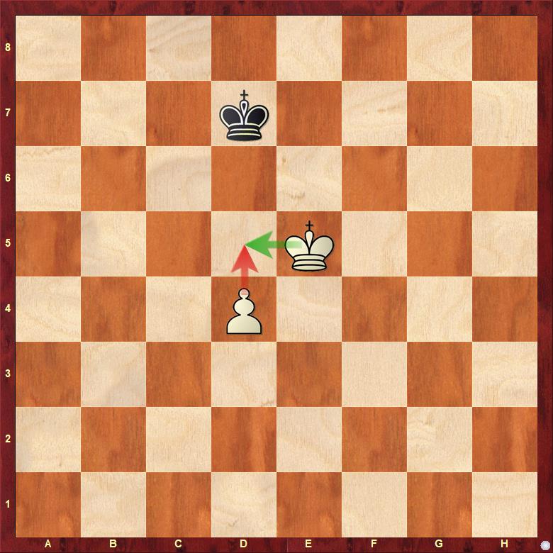 Pozor, král tedy musí chodit (skoro až do konce) před pěšcem! Tady vyhraje 1. Kd5!, naopak jen remizuje 1. d5??.