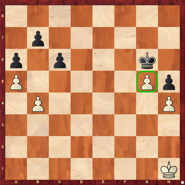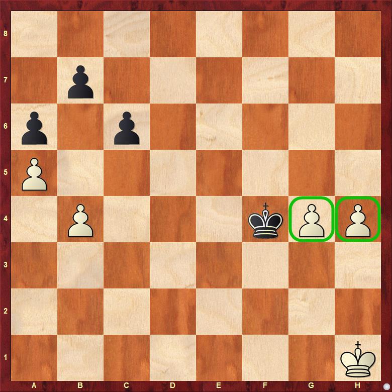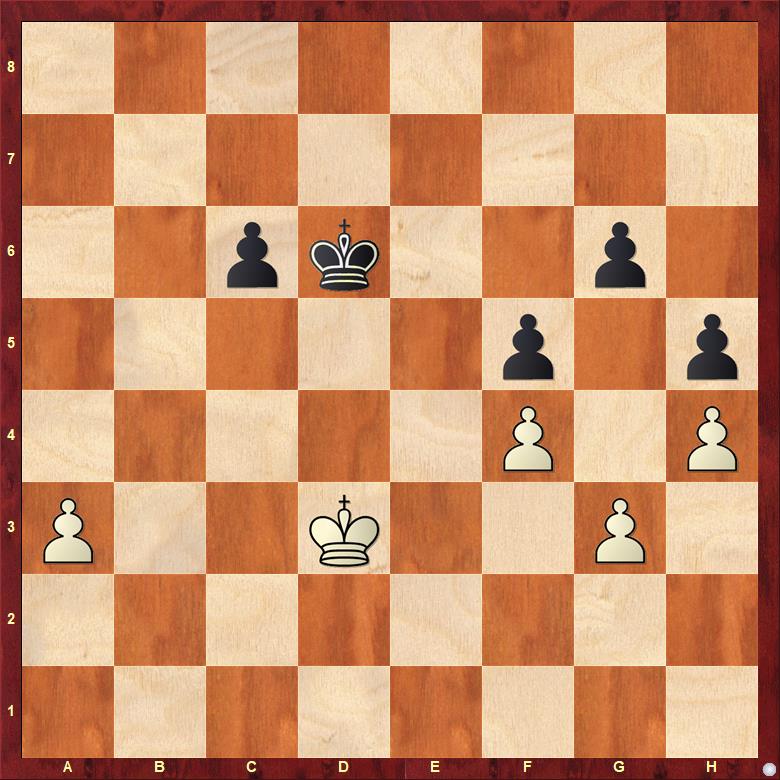 Tady je velmi důležitá věc: vzdálený volný pěšec. Protože pěšec a4 je dál od královského křídla než pěšec c6, bílý vyhraje. Černý totiž musí králem a pěšce hlídat, a než ho sebere, bílý sebere pěšce c6 a dojde na královské křídlo. I kdyby tady byl černý na tahu, nepomůže si, např. 1. … Kc5 2. Kc3 Kb5 3. Kb3 Ka5 4. a4 Ka6 5. Kb4 Kb6 6. Kc4 Ka5 (6. … c5 7. a5+!) 7. Kc5 Kxa4 8. Kxc6 Kb4 9. Kd6 Kc4 10. Ke6 Kd4 11. Kf6 Ke4 12. Kxg6 +-.