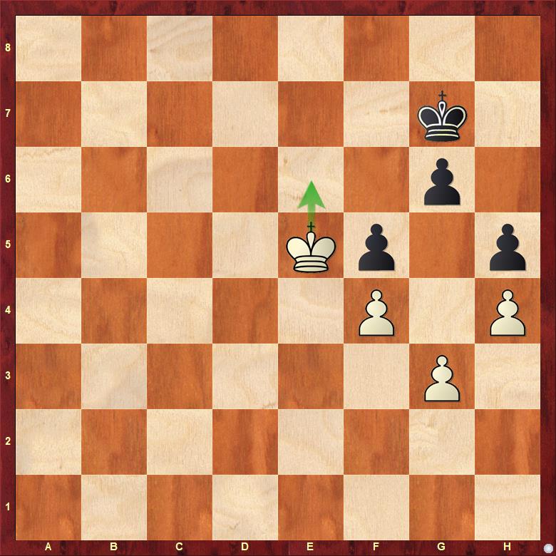 Další diagram ukazuje význam prostoru a aktivity krále. I když oba hráči budou tahat králem o jedno a zdálo by se, že černému stačí tahat třeba Kh7-h6-h7-h6, bílý ho vytlačí. 1. Ke6 Kg8 (jiné varianty jsou podobné) 2. Kf6 Kh7 3. Kf7 Kh6 4. Kg8! a černému došly rozumné tahy, je v nevýhodě tahu (tzv. zugzwangu). 4. … g5 5. hxg5 +-