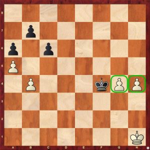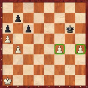 Tohle nejsou spojení volní pěšci, vypadají zranitelně, ale když se to hraje šikovně, i tito pěšci vzdálení o sloupec se navzájem jistí. Kdyby byl černý na tahu a zahrál 1. … Kh5?, dá bílý 2. f5! a nelze Kxh4?? 3. f6. Černý by hrál 2. … Kh6 3. Kb2 Kg7 a pozor, 4. h5! Kf6? 5. h6! atd. (Zrcadlová je varianta 1. … Kf5? 2. h5! atd.)