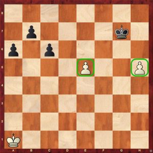 Tady ani černý na tahu nezabrání proměně pěšců, i když jim bílý král nemůže přijít na pomoc: např. 1. … b5 2. e6! Kf6 3. h6 Kg6 4. e7 Kf7 5. h7+-.