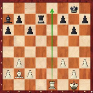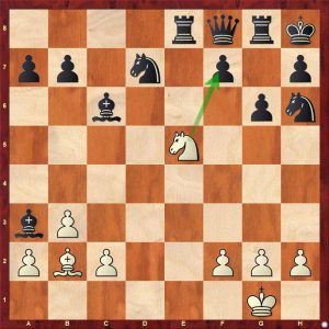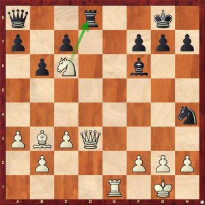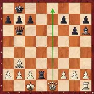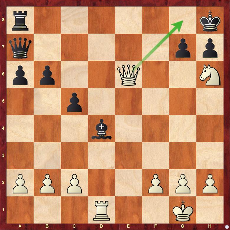 8) Tah 1. De8+?? je opět hrubka, černý má připravený odtažný šach: 1. … Vd8+! To je šach od střelce, bílý přijde o dámu buď na e8, nebo na e3. (Jediná možnost bílého ještě hrát byla 1. Kb1!)