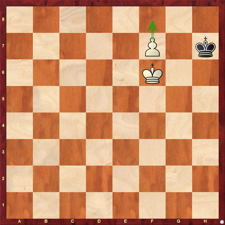 3) 1. f8D?? je hrubka, vznikl by pat. Bílý by mohl vyhrát např. po 1. Ke7, ale co má dělat, když už nedočkavě sáhl na pěšce? 1. f8V!! a dokonce dá dalším tahem mat: 1. … Kh6 2. Vh8 mat.