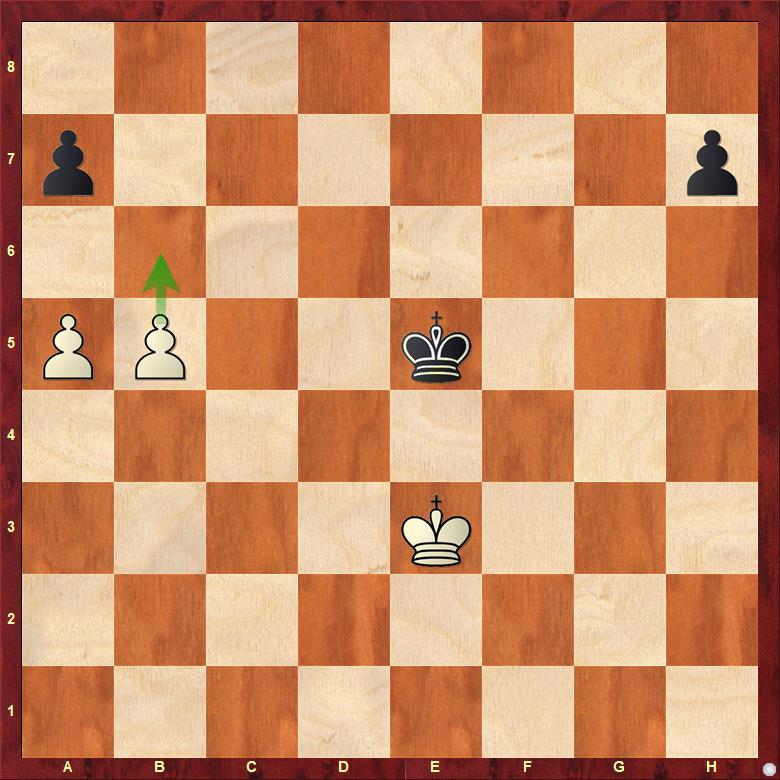 9) Jít honem honem do dámy bývá zbrklé, tady to ale jde – ovšem jen tehdy, pokud vidíte druhý tah bílého. Po 1. b6! axb6 nemí zahrát 2. axb6?? Kd6 remis, ale 2. a6!! a díky oběti pěšce si postaví dámu. (Šlo to i opačně: 1. a6! Kd6 2. b6!! +-.)