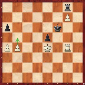 Bílý má ve věžovce o pěšce víc. To by ještě tak nevadilo, ale problém je ve figurách. Černá věž stojí špatně – je pod volným pěšcem, nemá žádný tah, bílý by stavěl dámu. Bílá věž stojí dobře – za volným pěšcem. Bílý král útočí, černý král brání. Černý nesmí brát g pěšce, po výměně věží by mu na dámském křídle utekl pěšec do dámy. Poslední obrana černého je tahat Kf6-e6-f6-e6. Ale bílý jednoduše zapojí pěšce dámského křídla. Tahem 59. b5! vytváří volného pěšce. 59. … axb5 60. Kxb5 Ke6 61. b6