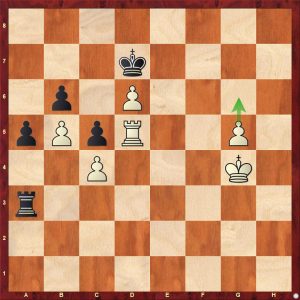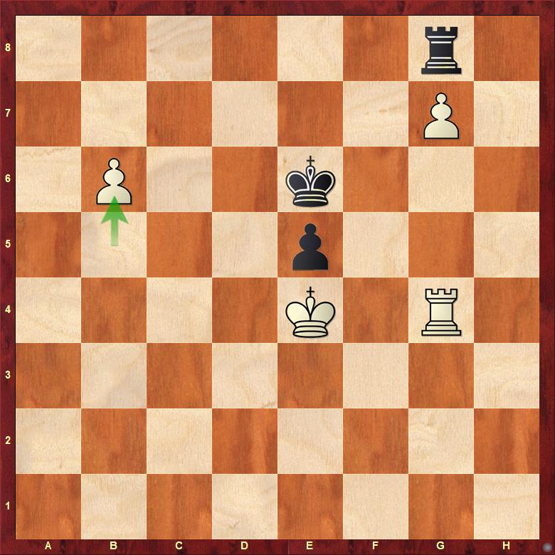Známý trenér a pořadatel hraje na výhru, i když materiál je stejný. Má totiž dva volné pěšce podporované věží a králem. Černý má taky volného pěšce (na a sloupci), ale to nebude stačit. Po 74. g6! se pěšec nedá chytat králem, to by uteklo déčko. Dá se chytat věží zdola. 74. … Va1! Kdyby teď bílý zbrkle zahrál 75. g7??, přišlo by 75. … Vg1+ a 76. … Vxg7 a najednou by měl výhodu černý! Je třeba pomoci pěšci věží. To jde hned dvěma způsoby: 75. Vg5! (Druhý způsob byl 75. Vd3! Vg1+ 76. Vg3 – takzvaný most.) 75. … Kxd6 (Po 75. … Vg1+ 76. Kf5 Vf1+ 77. Ke5 Vf8 78. g7 Vg8 79. Kd5 a4 80. Vg3 by to bylo složitější, to už je varianta pro pokročilé). 76. g7 a černý se vzdal, bude dáma.