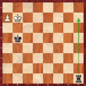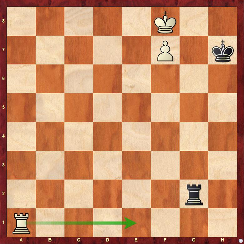 Bílý má pěšce na sedmé řadě. Rád by odešel králem na e sloupec a postavil si dámu. Černý by se ale bránil šachem věží (Ve2+). Proto bílý zahrál 58. Ve1 a černý se vzdal. Bílý zahraje Ke7 nebo Ke8 a postaví si dámu. Černý ještě může zkusit 58. … Vf2 59. Ke7 Kg7. Dvěma figurami pokryl proměnné pole pěšce (f8) a hrozí ho sebrat. Jenže bílý má mezišach 60. Vg1+, král musí zpátky a bílý už dámu postaví.