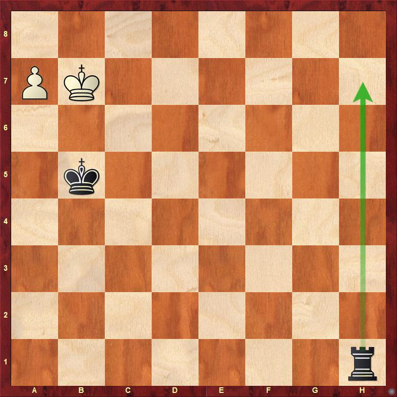 Ne náhodou jsou všechny ukazované koncovky věžové – je to velmi častý typ koncovky! Tady už je věž jenom jedna (bílý musel svou dát za pěšce), ale bílý má pěšce na předposlední řadě a hrozí stavět dámu. Černý zahrál 60. … Vh7+! a po 61. Kb8 by si někdo mohl říct, že je třeba pořád šachovat, aby si bílý nepostavil dámu. Ale černý využívá toho, že krále zahnal na kraj, a hraje 61. … Kb6! Když si teď bílý postaví dámu 62. a8D, dostane 62. … Vh8 mat! Bílý ještě zkusil 62. a8J+!, kvůli šachu se mat dát nedá, ale po 62. … Kc6! se vzdal, protože ztratí jezdce (nebo po Kc8 ten mat dostane). Jezdec proti věži může být remíza, ale ne, když je černý takhle v koutě.