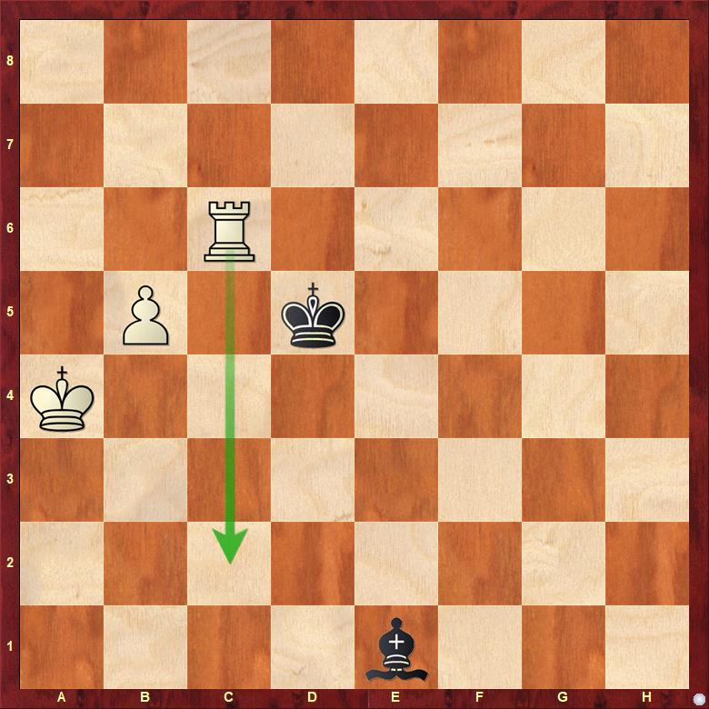 Věž proti střelci je remízová koncovka, bílý má ale navíc volného pěšce. Teď s ním nesmí táhnout, po b6?? by přišlo Kxc6. Zahrál ale 72. Vc2! Všimněte si, že jde na bílé pole, aby nemusel hlídat, jestli střelec věž nenapadne. Věž hraje důležitou roli – odřezává černého krále od bílého pěšce (od jeho proměnného pole). Černý zkusil 72. … Sg3 (pole f2 mu vzala bílá věž), ale po 73. b6 se už vzdal. Střelec sice kryje b8, ale bílý tam může proniknout králem po a sloupci nebo ještě rychleji zahrát Vc8 (např. 73. … Sf4 74. b7 Sb8 75. Vc8).