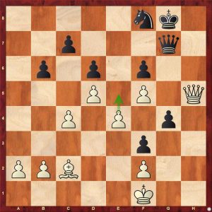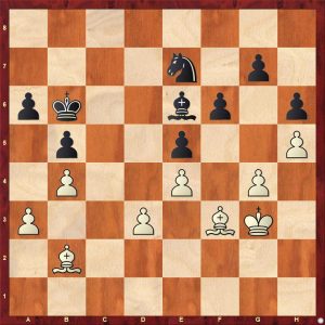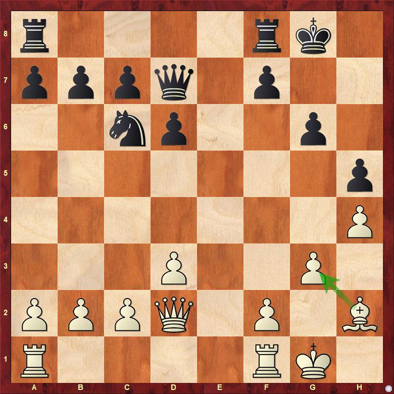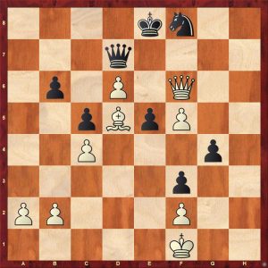 Černý nemá dobré tahy, hrozí mu hlavně 50. Sc6!! Dxc6 51. De7 mat, po 49. … Jh7 je 50. Dh8+! Jf8 51. Dxe5+ Kd8 52. Df6+. To nejsou snadné varianty, ale stačí si všimnout, jak se v porovnání s minulým diagramem rozehrál bílý střelec.