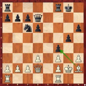 Proto Aljechin obětoval dokonce několik pěšců: 44. e5!! dxe5 Kdyby černý nebral, bílý by zahrál e6 a pěšec by byl obrovsky silný. Kdyby hrál 44. … fxe5, přišlo by 45. f6!! Dxf6 46. Dxg4+ Kf7 47. Se4, bílý by dostal pěšce f3 a měl by útok. 45. d6!! Šlo i 45. c5!! bxc5 46. Sb3 se strašnou hrozbou d6+. 45. … c5 Nejhezčí to je po 45. … cxd6 46. c5!! – oběť třetího pěšce a po jeho braní Sb3+. 46. Se4! A střelec se dostane na d5. 46. … Dd7 47. Dh6! Než dá šach po bílých polích, bere králi černá. Černý se vzdal, nepomůže ani 47. … Kf7 48. Sd5+ Ke8 49. Dxf6.