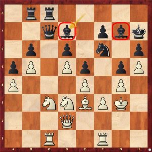 Oba bílí střelci zatím stojí špatně, a kdyby byl na tahu černý, zahraje Jc6, vezme pod kontrolu pole d4 a pozice je remízová. Ale bílý otevírá hru: 1. d4! exd4 (1. … Jc6 2, d5 +-) 2. Sxd4+ Jeden střelec hraje. 2. … Kc7 3. e5! A už hrají oba střelci a černý stojí špatně.