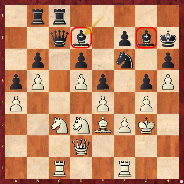Bílý střelec je omezen vlastními pěšci a moc mu nepomůže ani jít přes a4 – pole, kam by mohl dojít (třeba d7, f7, g6) jsou krytá. Ale zkuste si představit, že by bílí pěšci zmizeli! Rázem by byl ze střelce démon a po Sb3+ by měl černý problém.