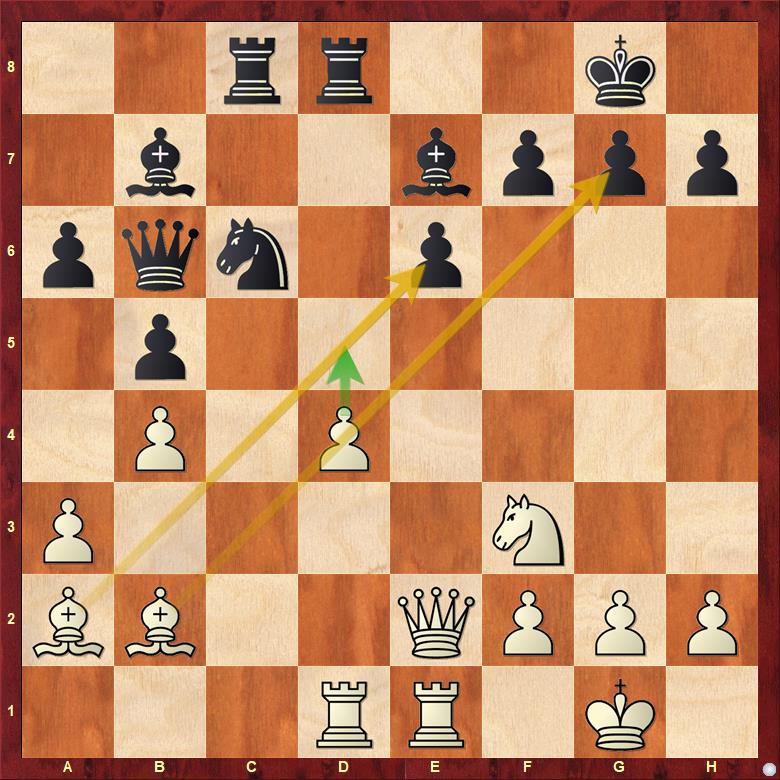 Bílý tu hraje 1. d5! a jednak otevírá dráhu střelci b2, jednak výměnou odstraní pe6, který omezuje Sa2. Jedním tahem tak vylepší oba střelce.