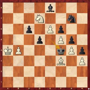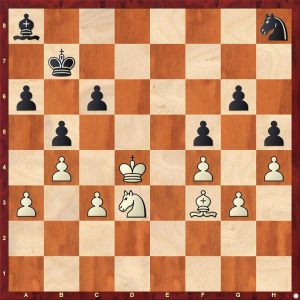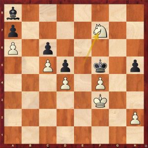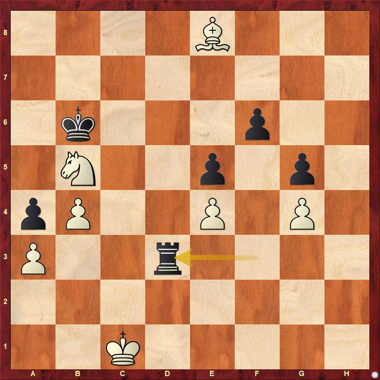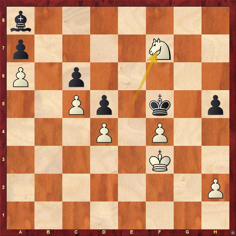 Bílé figury jsou zdánlivě aktivní, ale ve skutečnosti ztracené! Jezdec nemá tah! Střelec ho musí chránit, takže taky nemá tah! Bílý zkusil 56. Kc2, aby jezdec vyklouzl přes c3, ale po 56. … Vd8 už ztrácí figuru.