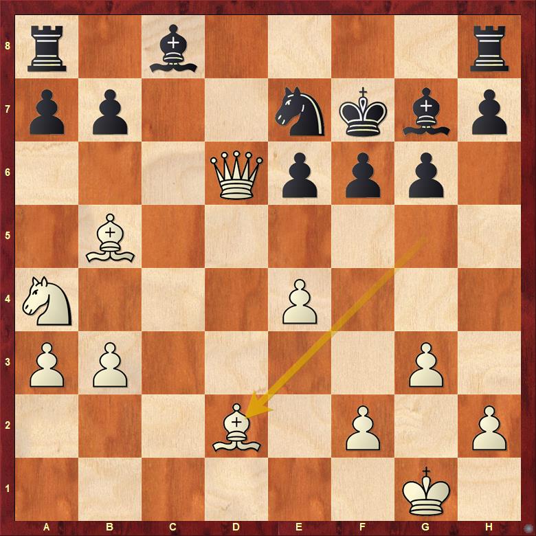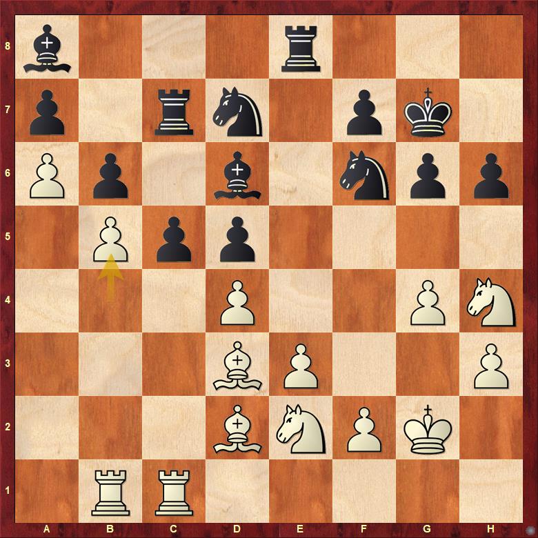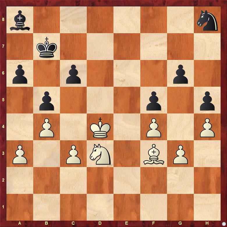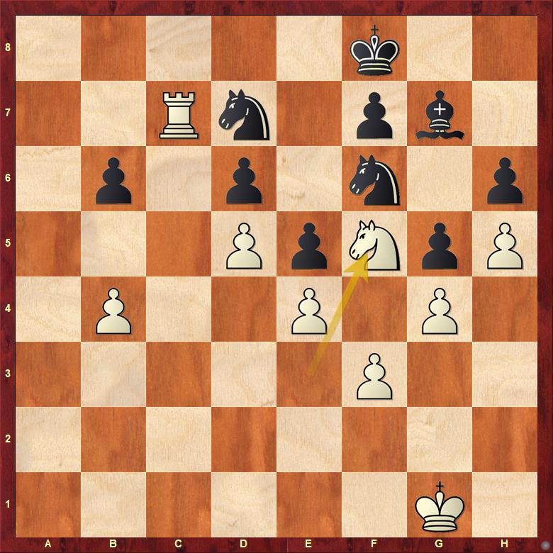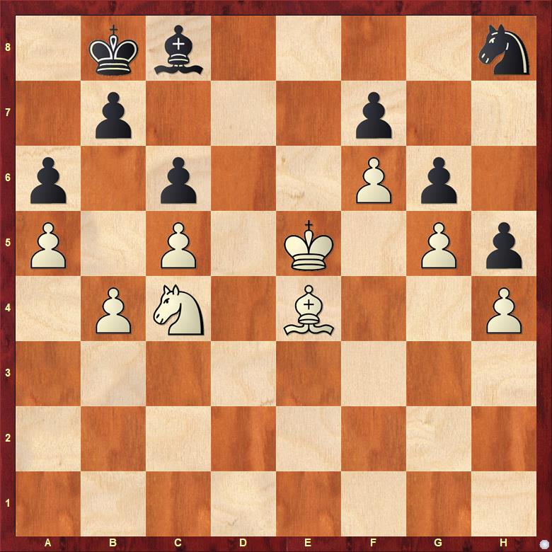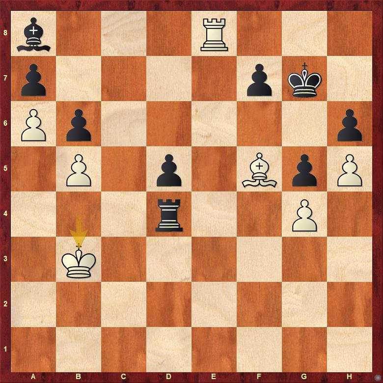Tohle není přímo pozice z partie, ale z varianty, která by přišla, kdyby se černý bránil houževnatěji. Jeho střelec nesmí hrát pro mat na f7, po tahu Vd8 přijde Vxb6+ a a pěšec půjde do dámy, král nesmí hrát pro ztrátu střelce. (Hráno letos v březnu – je to vůbec možné?)