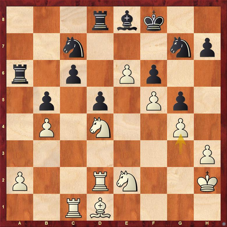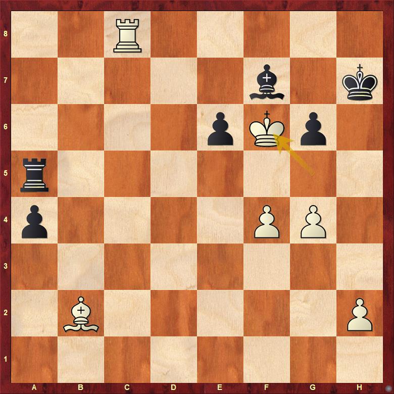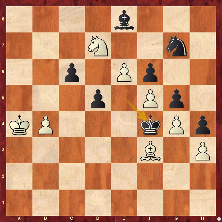 Tady jsem právě tahem 35. g4 definitivně uvěznil jak jezdce g7, tak střelce e8, takže černý hrál pak bez dvou figur. V takové pozici se vůbec nemusí spěchat, takže ještě po dalších 37 tazích se černé figury vůbec nehnuly z místa!