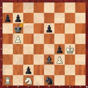 Materiál je vyrovnaný a černý má nebezpečného volňáka, ale mně hraje všechno, jemu jen věž. Po 65. … Va7 nejdrtivěji vyhrávalo 66. Se5!! (já jsem hrál Sa3 a partii jsem vyhrál taky) 66. … a3 67. Kg5 Sg8 68. Vc3! a mat po h sloupci.