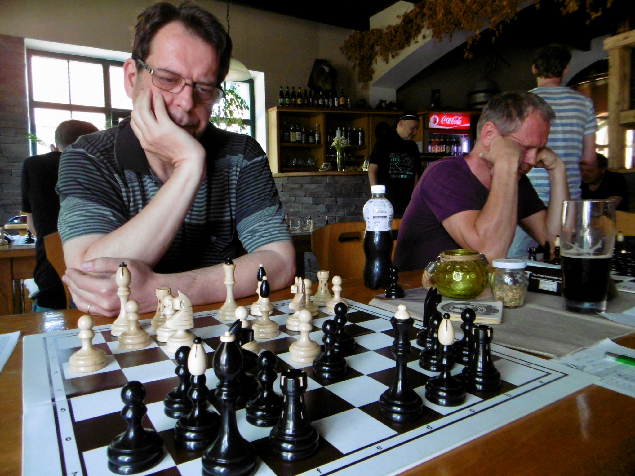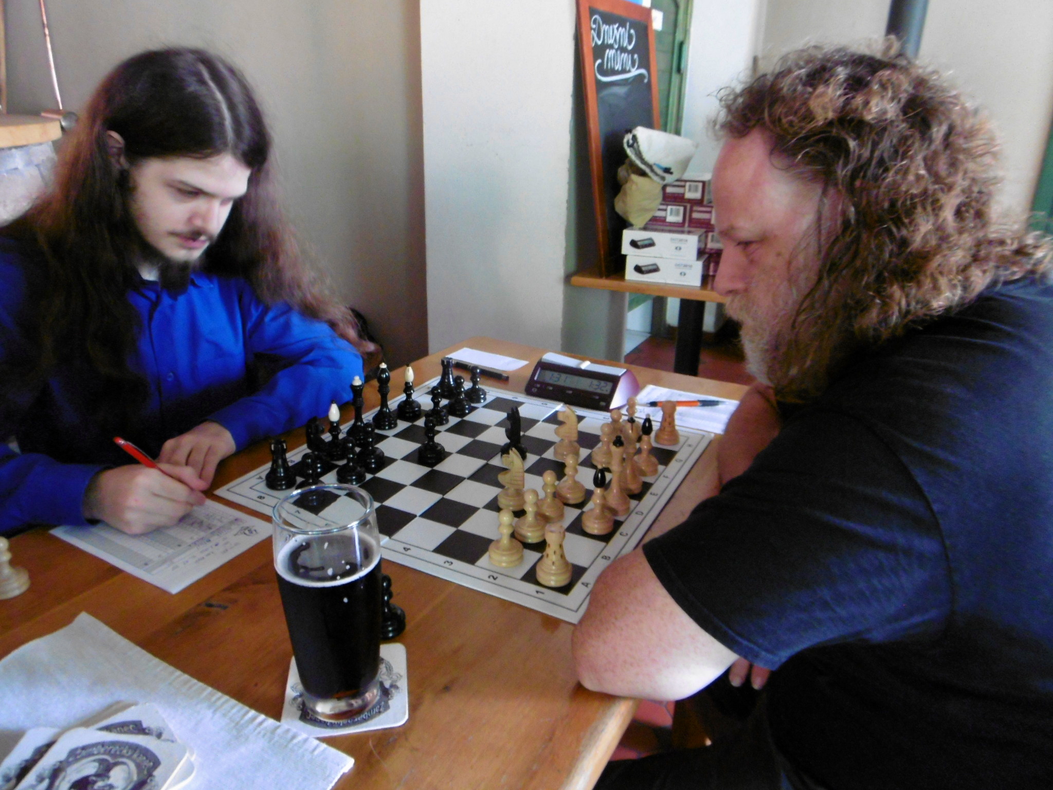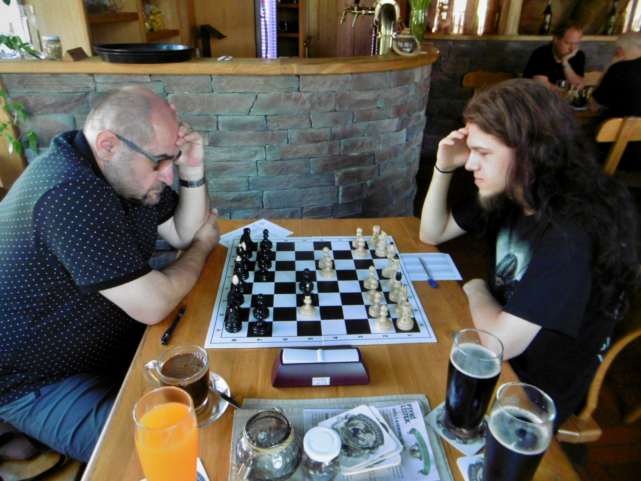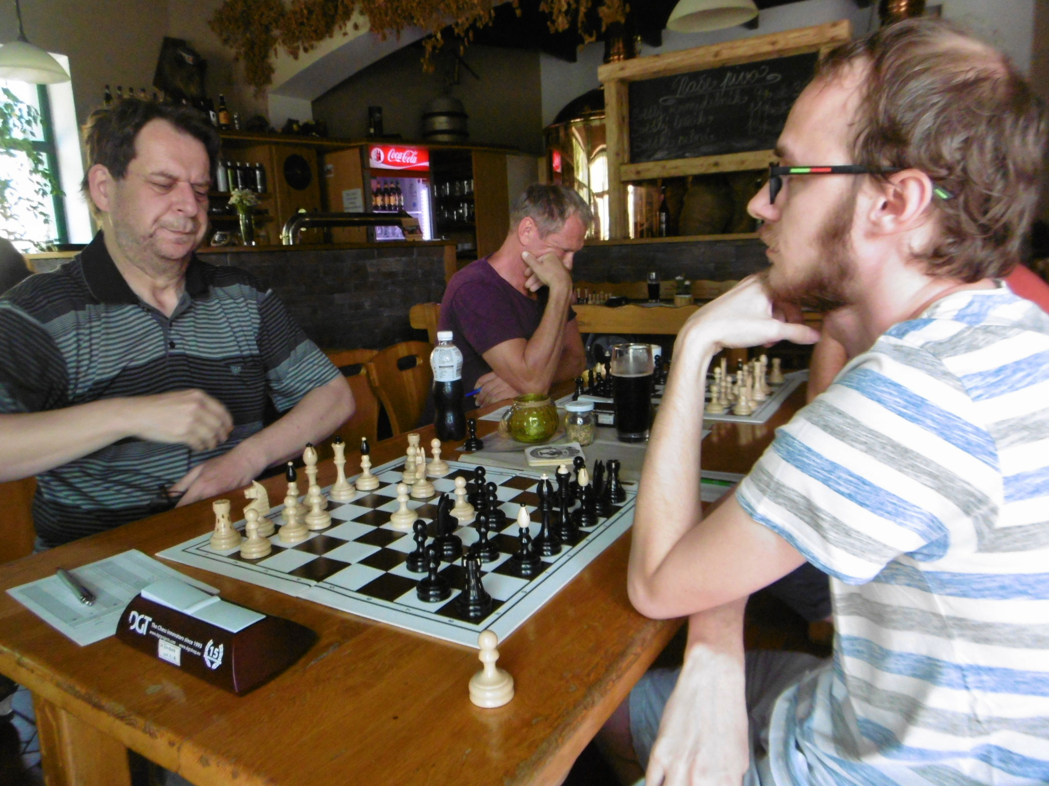 Zbyly dvě partie a zatímco se venku žvanilo, blicalo a popíjelo, zuřivý reportér i Kuba Netušil utahovali šrouby. Bohužel ani jedno nevyšlo, můj soupeř se výborně popasoval s vlastní časovkou, Netík vydoloval pěšce, pak druhého, ale nestejnopoláci byli proti. Takže nakonec 4:4, v prázdninové atmosféře, s výborným pivem – takový konec postupové sezona je fakt za odměnu 🙂