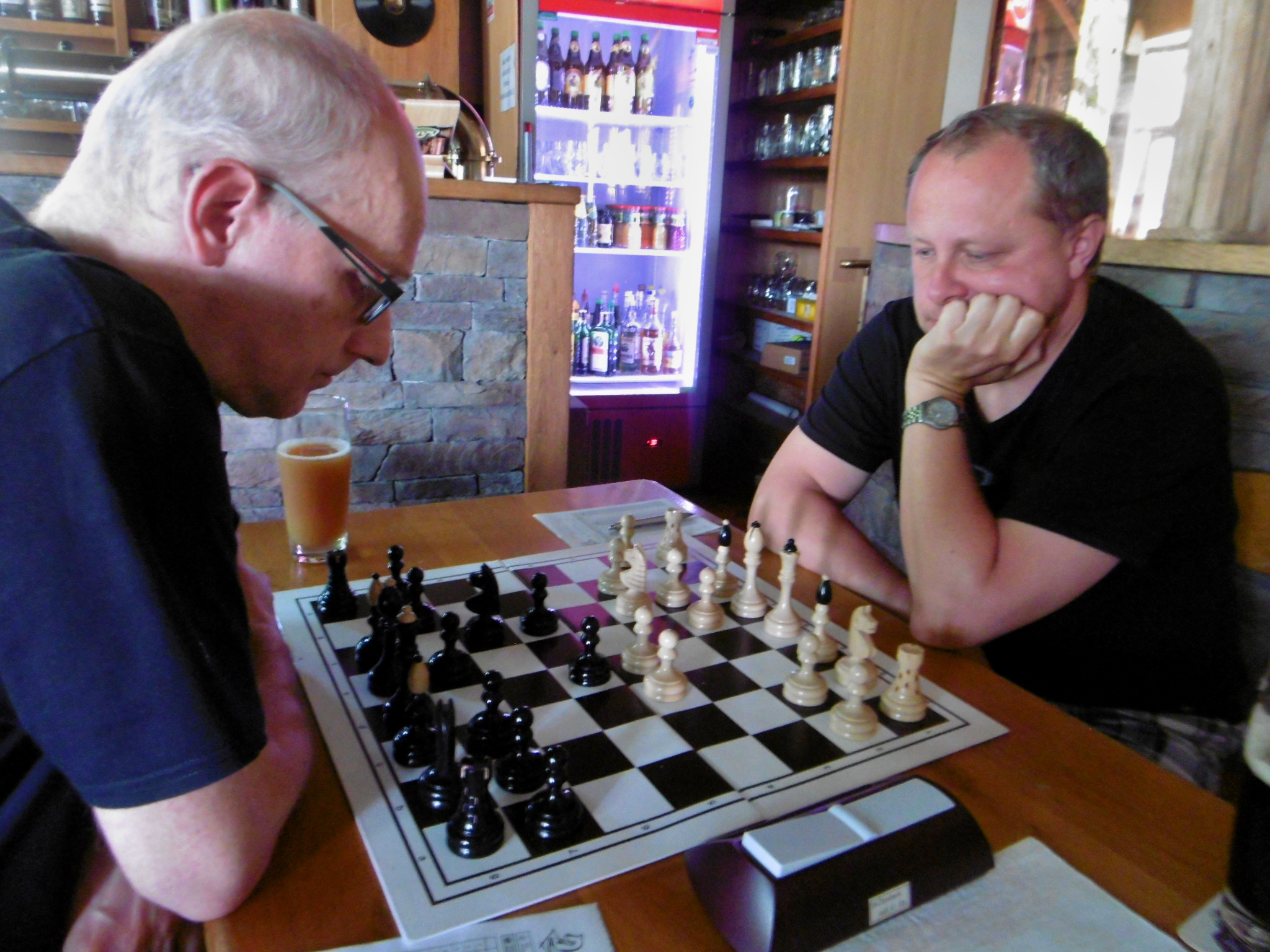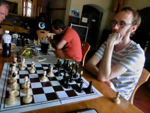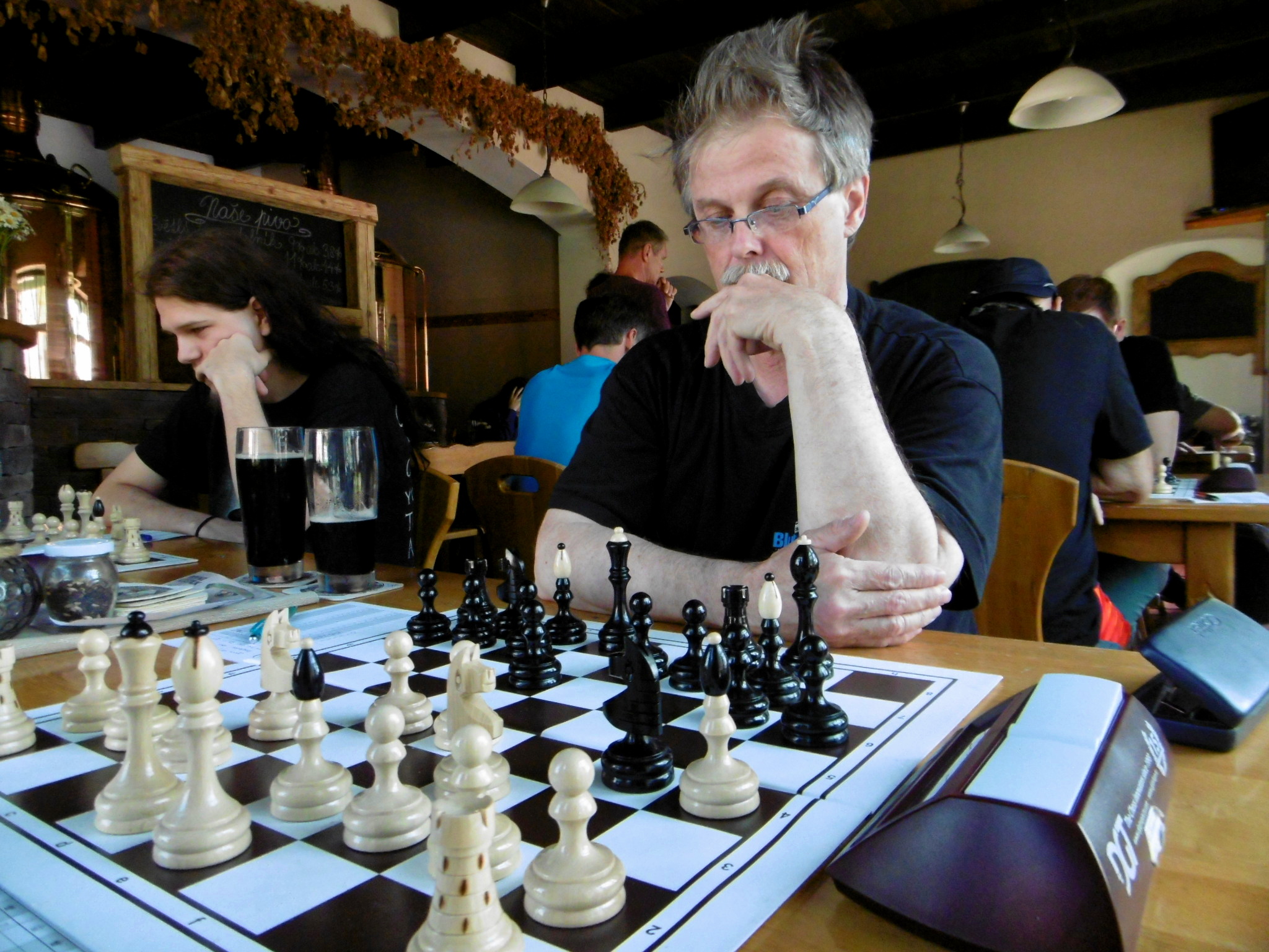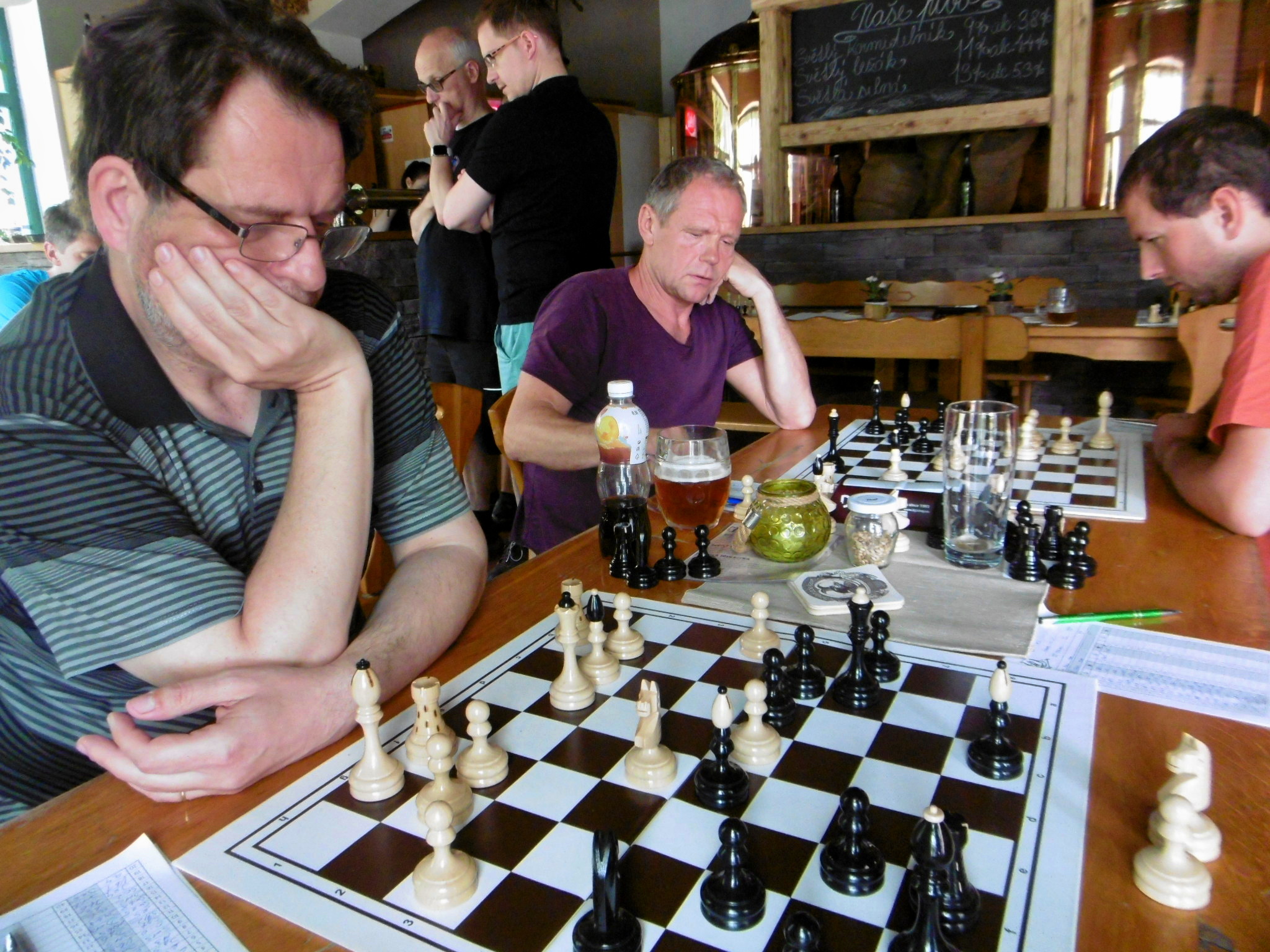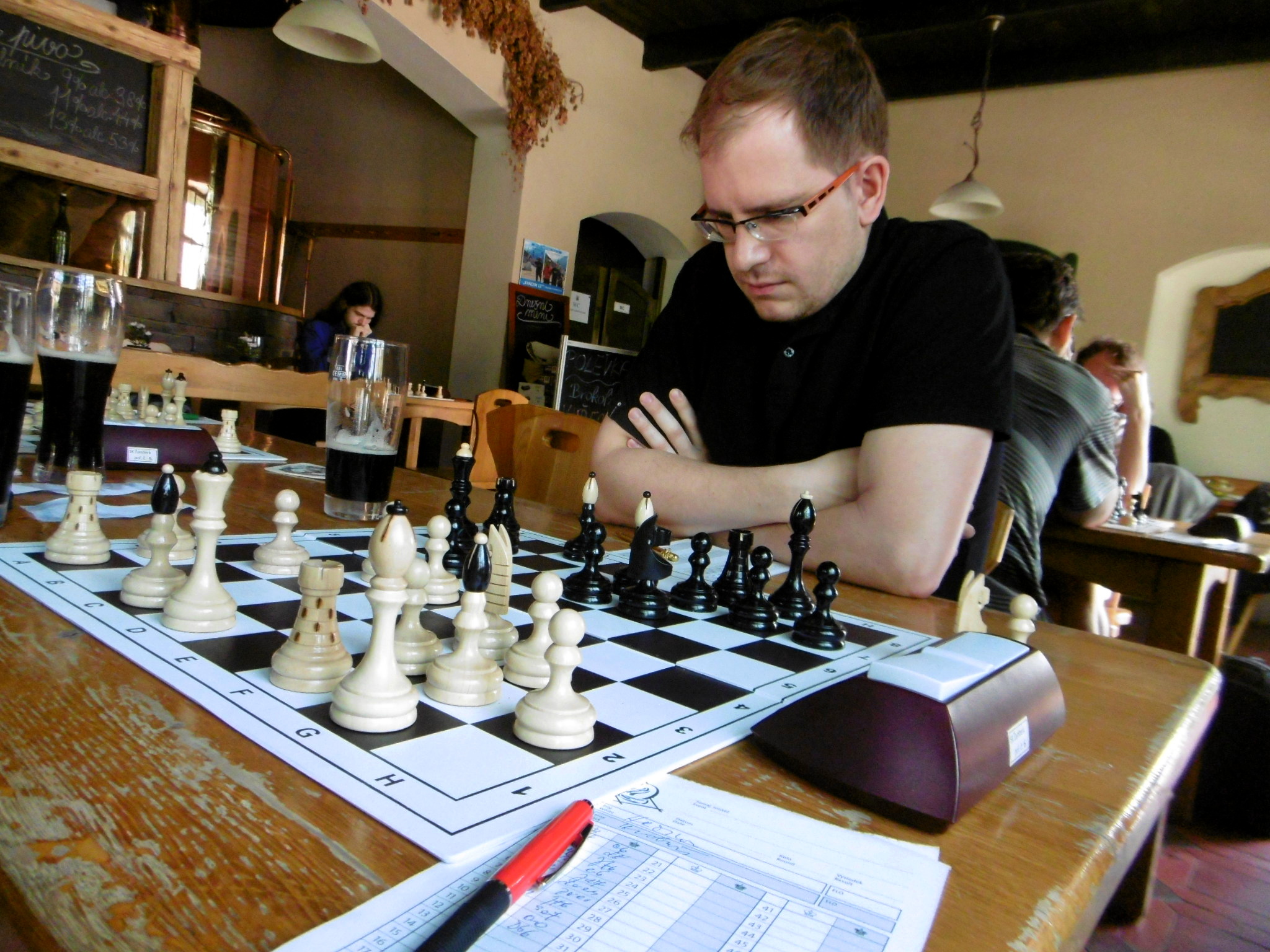 Zbyly dvě partie a zatímco se venku žvanilo, blicalo a popíjelo, zuřivý reportér i Kuba Netušil utahovali šrouby. Bohužel ani jedno nevyšlo, můj soupeř se výborně popasoval s vlastní časovkou, Netík vydoloval pěšce, pak druhého, ale nestejnopoláci byli proti. Takže nakonec 4:4, v prázdninové atmosféře, s výborným pivem – takový konec postupové sezona je fakt za odměnu 🙂