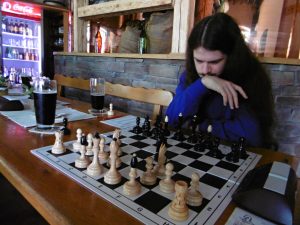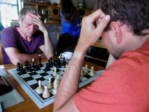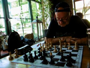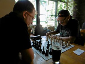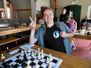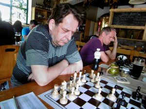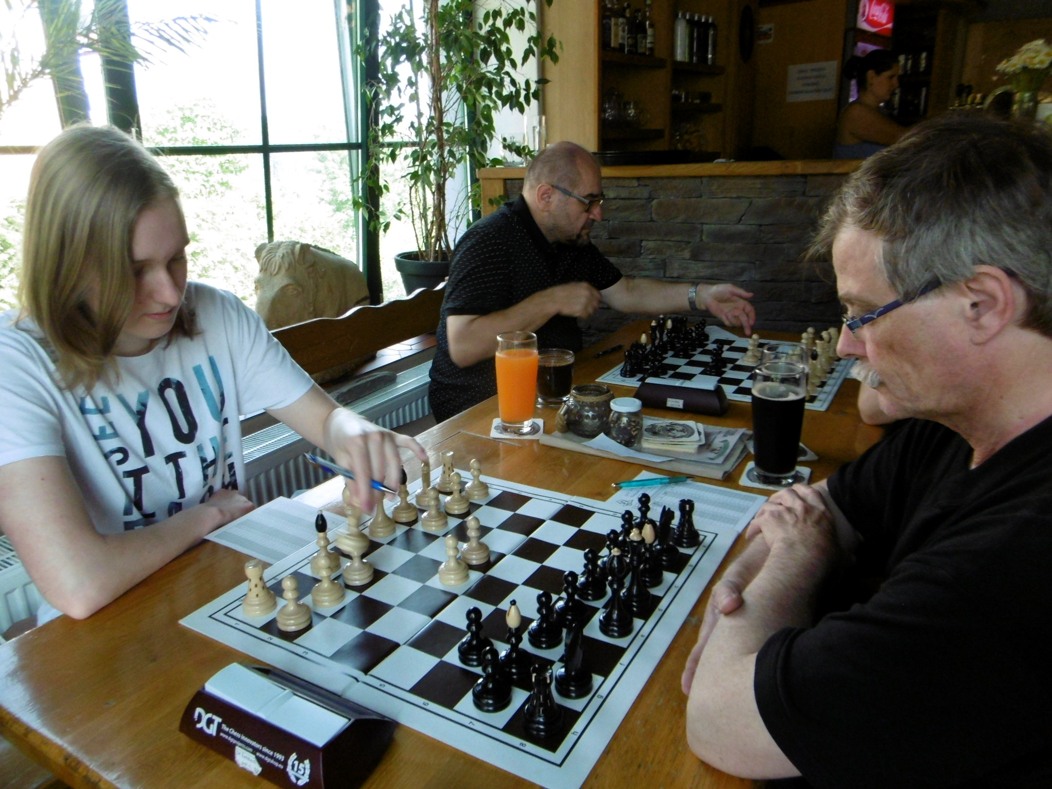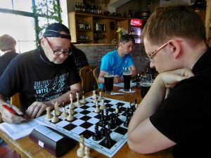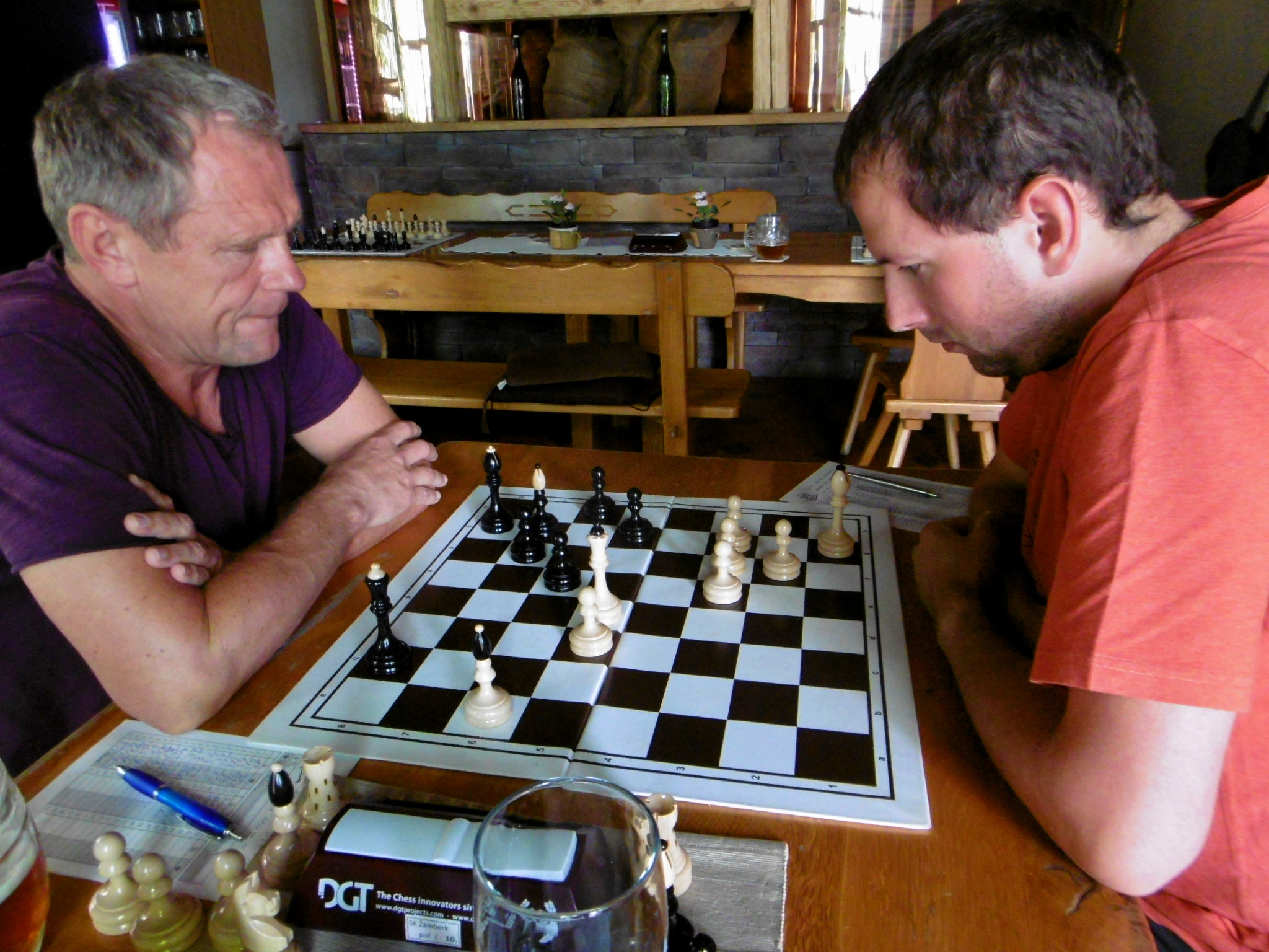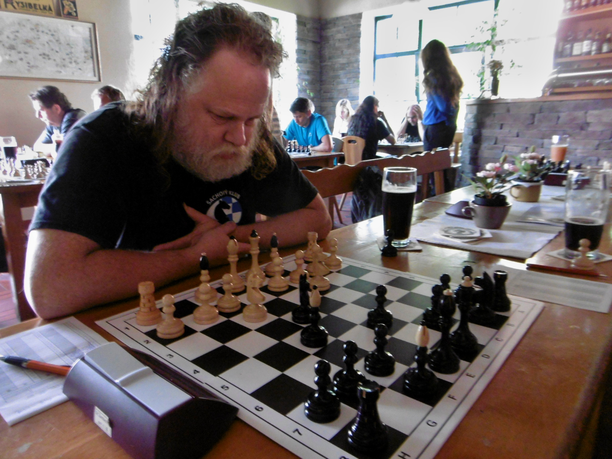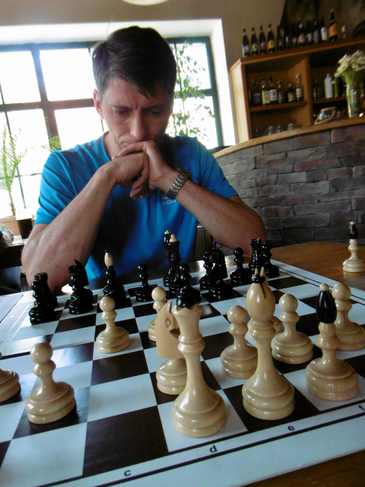 Zbyly dvě partie a zatímco se venku žvanilo, blicalo a popíjelo, zuřivý reportér i Kuba Netušil utahovali šrouby. Bohužel ani jedno nevyšlo, můj soupeř se výborně popasoval s vlastní časovkou, Netík vydoloval pěšce, pak druhého, ale nestejnopoláci byli proti. Takže nakonec 4:4, v prázdninové atmosféře, s výborným pivem – takový konec postupové sezona je fakt za odměnu 🙂