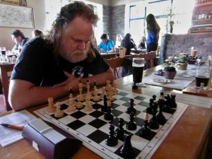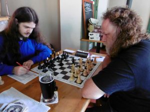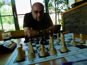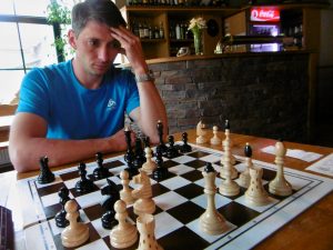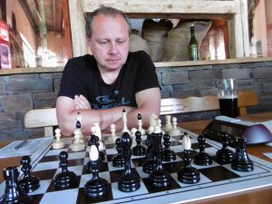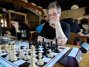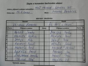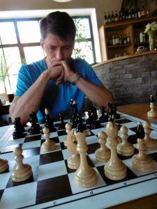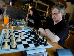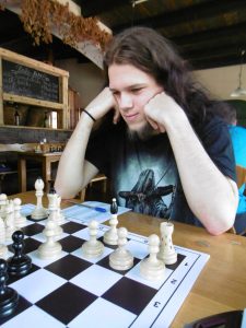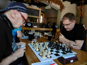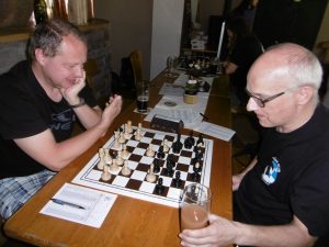 Havrlík – Hrobař 1/2 Něco anglického/katalánského/cosi, Vlastík po svém (domek, c6, tradiční výlet dámou na b6). Bílý ale měl aktivitu (silný Je5), náš hráč po výměnách slabé c6. Remíza nabídnutá za minutu dvanáct, bílý okamžitě přijal, ale jinak by to prý hrál pomalu a zajisté vyhrál 🙂