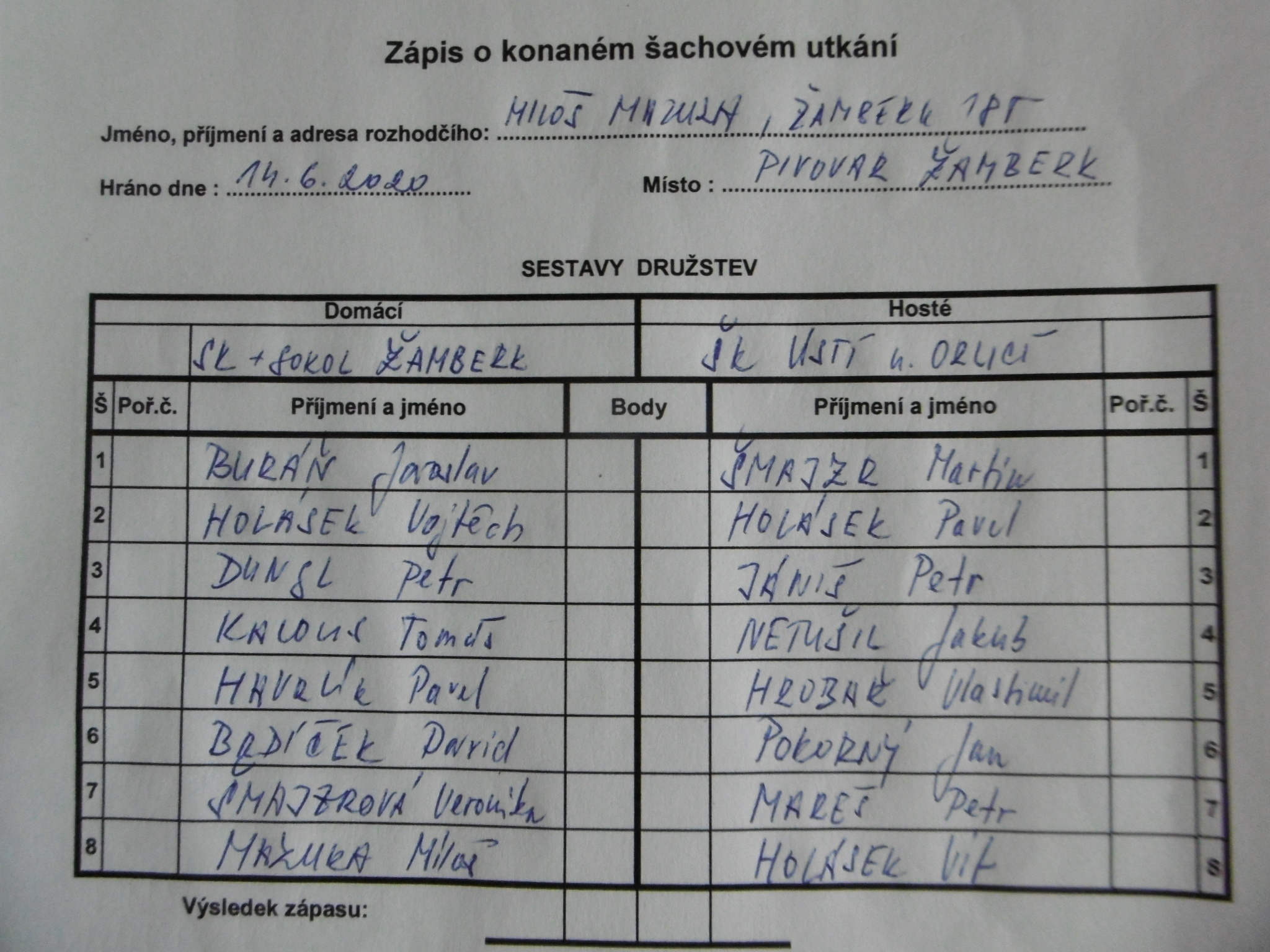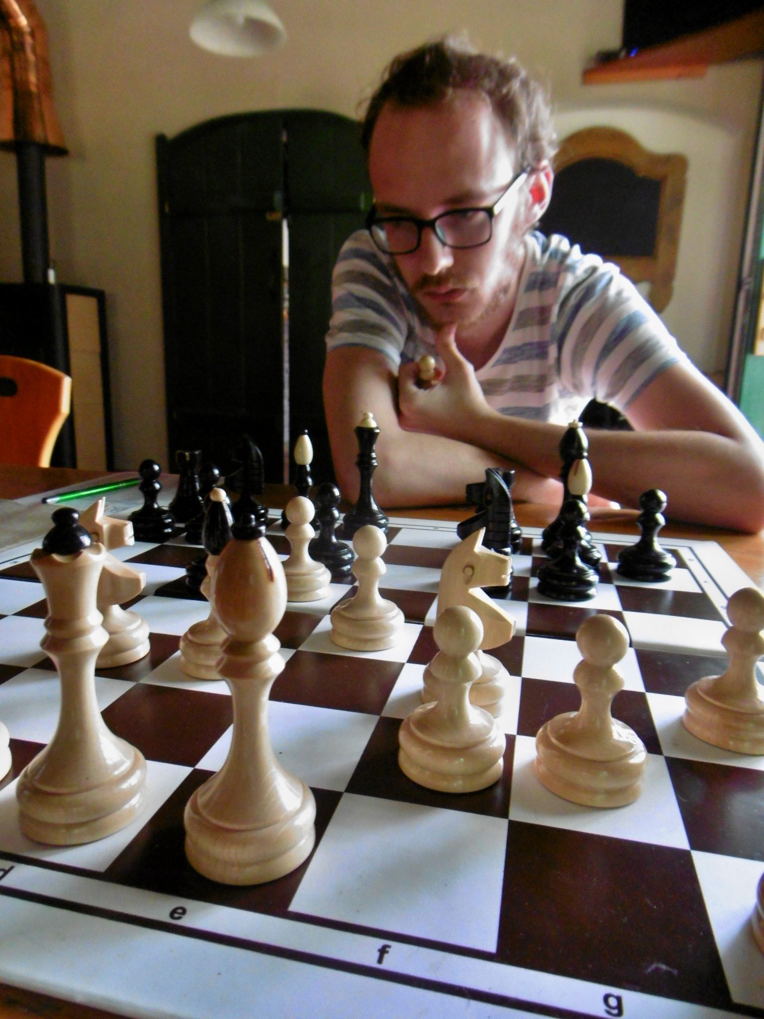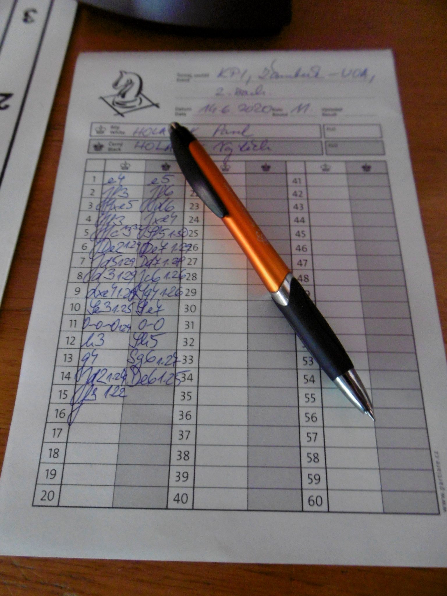 Pokorný – Brdíček 1/2 Já se tak těšil na šachy! Akorát teda v přípravě jsem koukal na všechny možné… s výjimkou Davida. Takže z vlastní hlavy, možná poprvé za družstva 1.d4 (výsledek dvouměsíčního blicání na lichess), abychom neopakovali sicilku z loňska. Nicméně partie měla podobný průběh – měl jsem prostor, plán, strategicky se mi to moc líbilo. Petr Mareš po partii a počítač doma můj optimismus trochu krotili, ale cítil jsem se v pozici dobře a před soupeřovou časovkou byl výhra na spadnutí. Jenže David opět prokázal, že má víc životů než kočka, ve vlastní kisně našel aktivitu (c6!), já už taky s poslední půlminutou ve 40. tahu frajersky (dle ploutve ovšem správně) obětoval kvalitu za protivného d4 oře, nicméně po nepřesnosti v tahu 41 jsem byl za remízu ještě rád. Její nabídka se spojila s druhém nabídkou s souběžně hrané partii Netušil – Kalous a pečetila na 4:4.