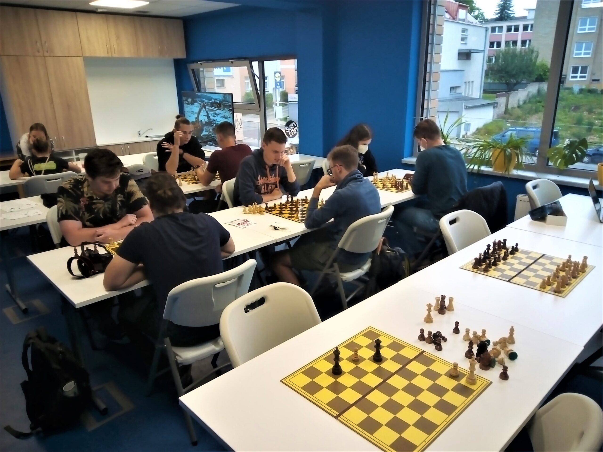 V pátek se stavila zahrát řada šachistů velmi odlišné úrovně, od nejmenších dětí přes bývalé gymnazisty, kteří vzpomínali na hru o přestávkách a vánoční turnaje, až po (bývalé?) hráče našeho áčka, jak ukazuje i jediná moje fotka.