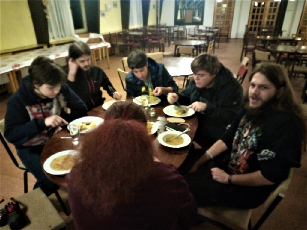 Oběd nenadchl. Polévka (OK), kousek masa s těstovinami (takže Vojta měl smůlu) a kapkou omáčky, jablko, čaj. Bez výběru, zhruba na úrovni školní jídelny (ale tam je výběr). Soňa brblala hodně, já jsem nenáročnej, ale za ubytování se socialistickým retro nábytkem, bez wifi na pokoji a za obyčejné jídlo je plná penze 590 už trochu dost, 580 by taky stačilo.