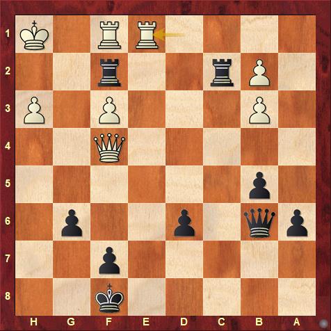 Tady jsem jako černý zahrál 32. ... De3!! Brát nelze dámou ani věží (proč?), bílý pokračoval ještě správně 33. Dxd6+ Kg8 34. Dg3, ale po 34. ... Vxf1+ 35. Vxf1 jsou bílé figury příliš pasivní, vybral jsem si 35. ... Dd2 a bílý si vytrpěl beznadějnou obranu až do 44. tahu.