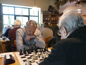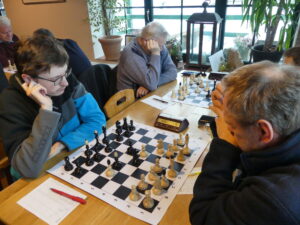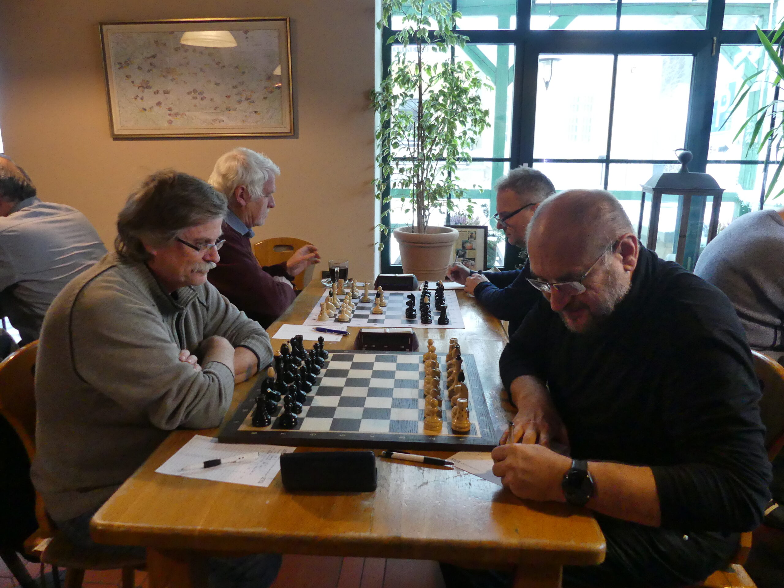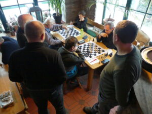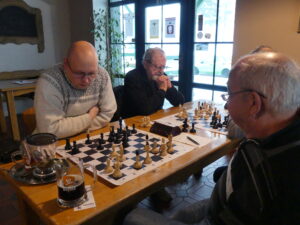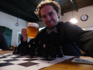Začínáme lehce po desáté, mimo rychlé remízy na trojce se všude bojuje. Dvě sicilky s c3, dvě králky, dvě anglické – jako bychom chtěli opisovat 🙂 Nejrychleji a k tomu černými smečuje náš kapitán David, navíc proti betonáři Karlu Kacálkovi – borce kola máme už v 11 dopoledne. Pak v takové poměrně crazy partii vítězím já, pročež se mohu poohlížet po nabídce na čepu. Na ostatních deskách je to zajímavá přetlačovaná, Jenda na první ve čtyřvěžovce s jezdcem a spoustou piků určitě nestojí hůř a má lepší čas, Jarda s malým supertalentem uklohnil pika a hraje to svoje. Moc se mi nelíbí pozice Honzy Smoly, nicméně bez věží s dámou a lehkými figurami nemá soupeř asi nic hmatatelného a náš hráč postupně zesiluje. Bohouš klasicky pozičně suší a spoléhá na kryté volné d5, Tomáš na osmé má prostor i čas na své straně. Rozhodnutí obstarali naši nejzkušenější, dál už jen naháníme skore. Jarda věnoval soupeři dobrý tréninkový materiál a podobnou partii z jednoho kusu vystřihl i Bohouš – smekám. Dohrávají Jendové svorně ve věžovce (Smolda s flokem víc) a Tomáš nemilosrdně utahující šrouby. Konečných 7:1 je nemilosrdných,  ale po právu.